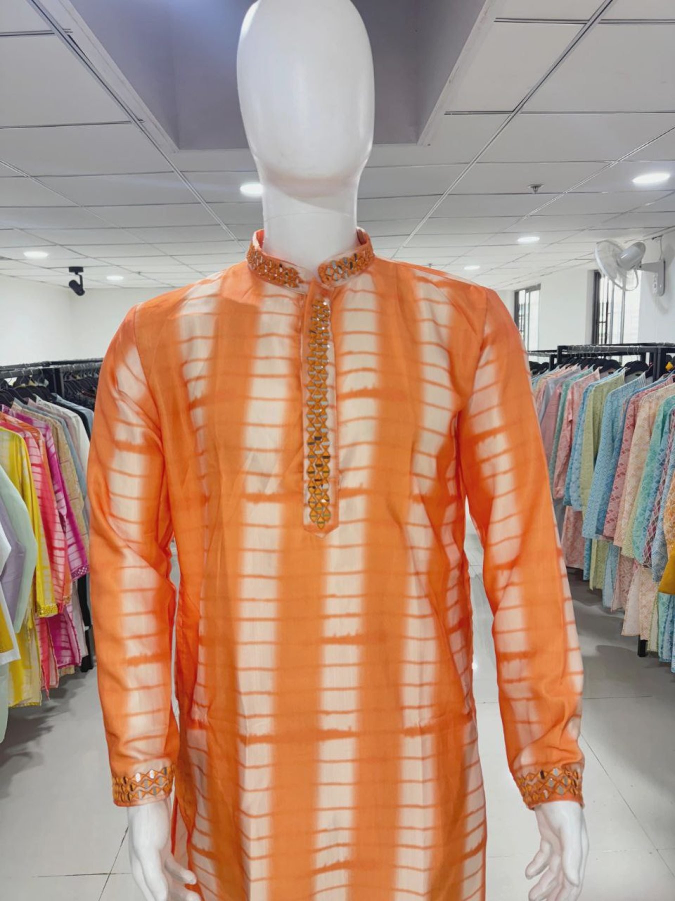 Upgrade your ethnic wardrobe with this luxurious Royal Silk Kurta Pajama set. Designed with stylish mirror work on the neckline, this knee-length kurta offers a regular fit with full sleeves for a perfect blend of tradition and elegance. Ideal for festivals, weddings, receptions, or cultural events.
