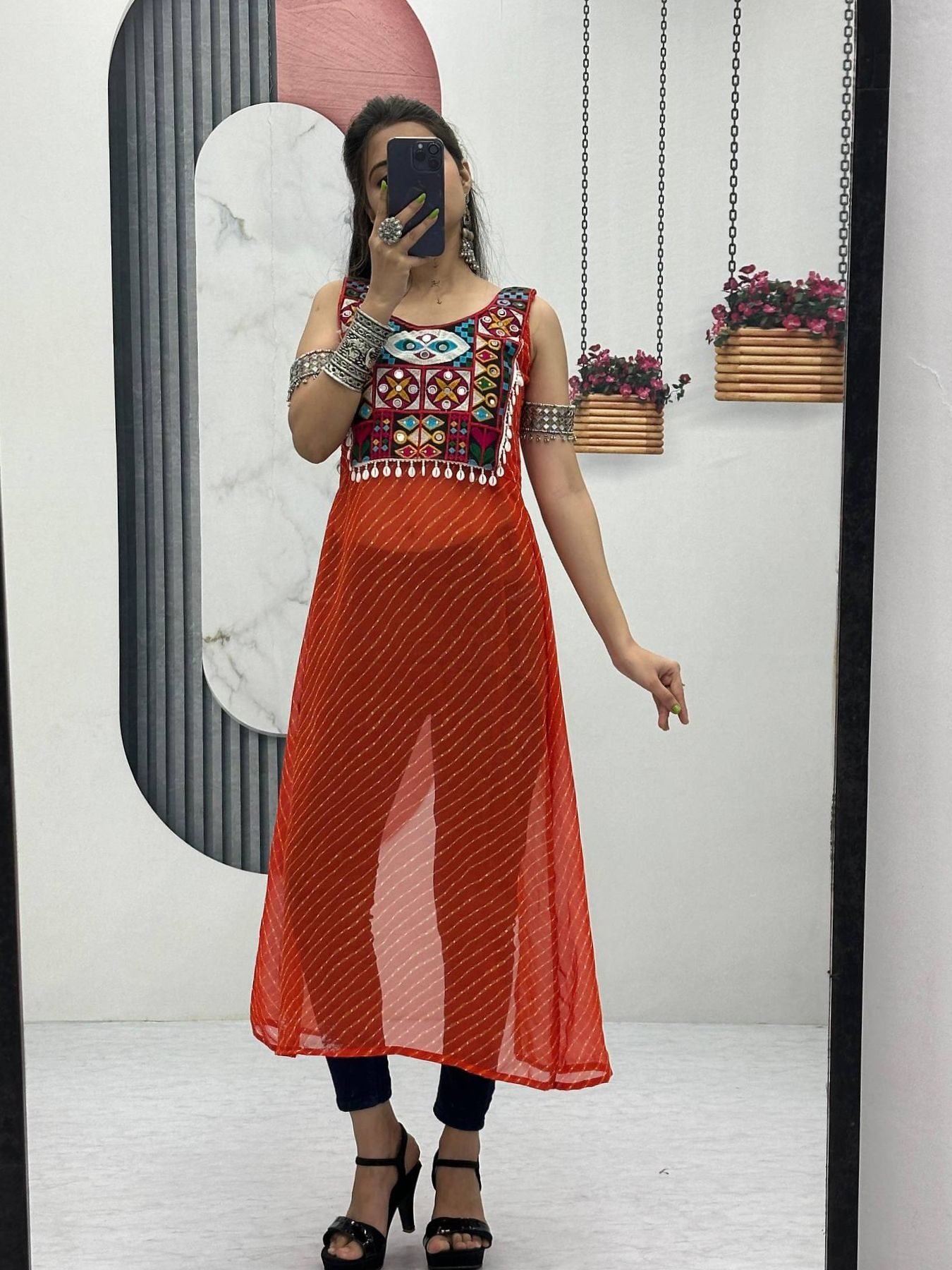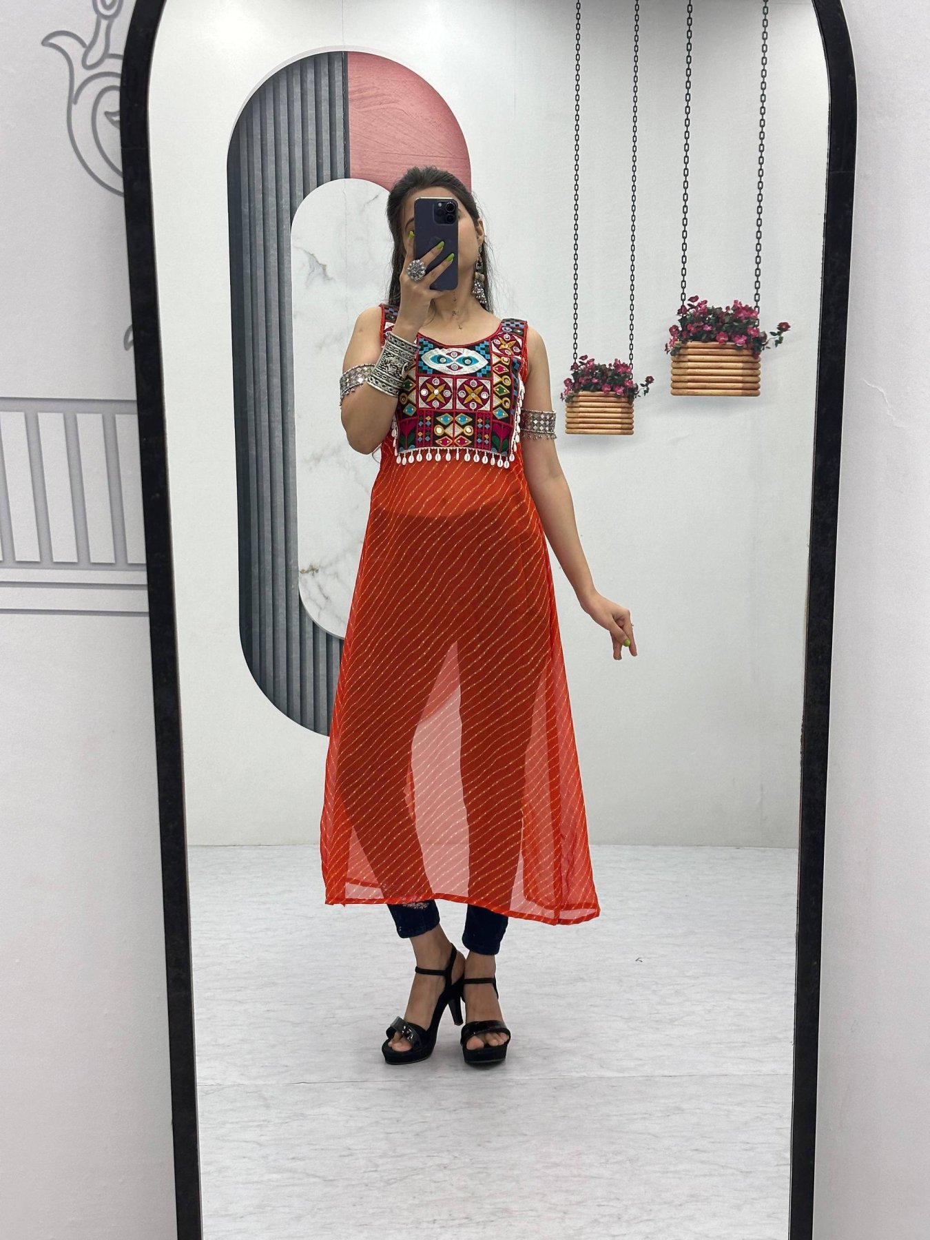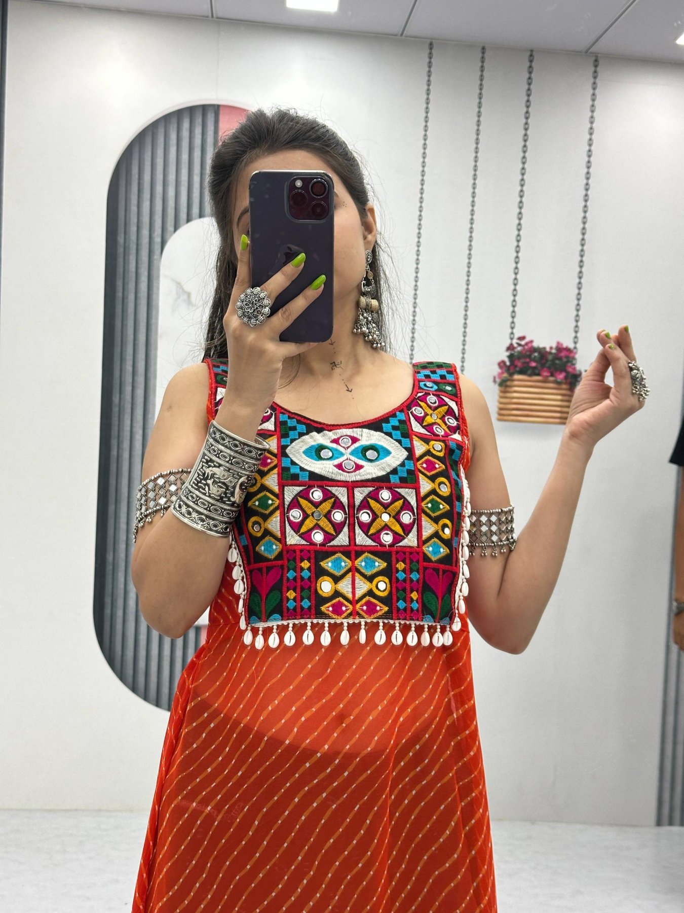 Orange Georgette Bandhej Kedya Top with Mirror Embroidery Designer Garba Outfits