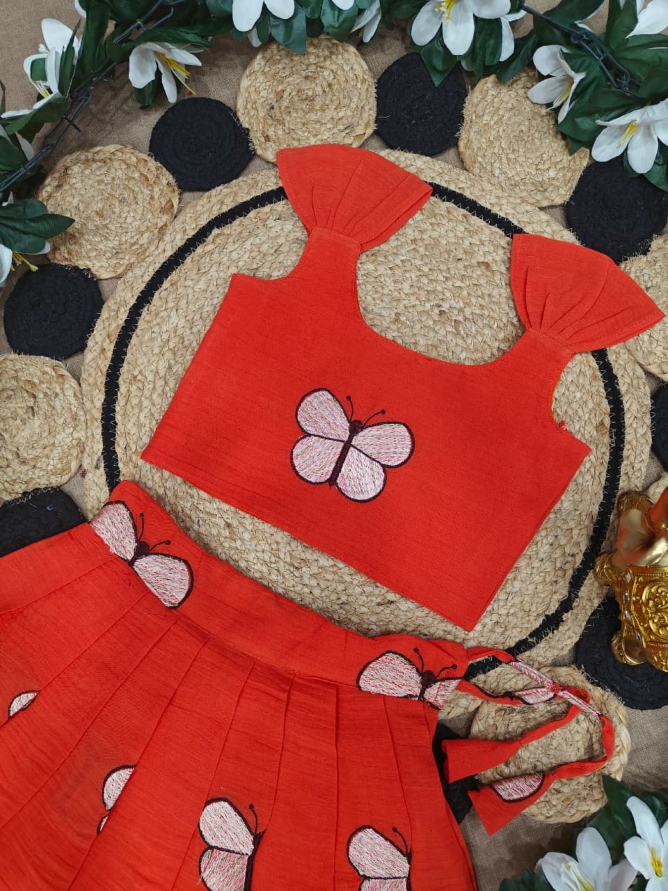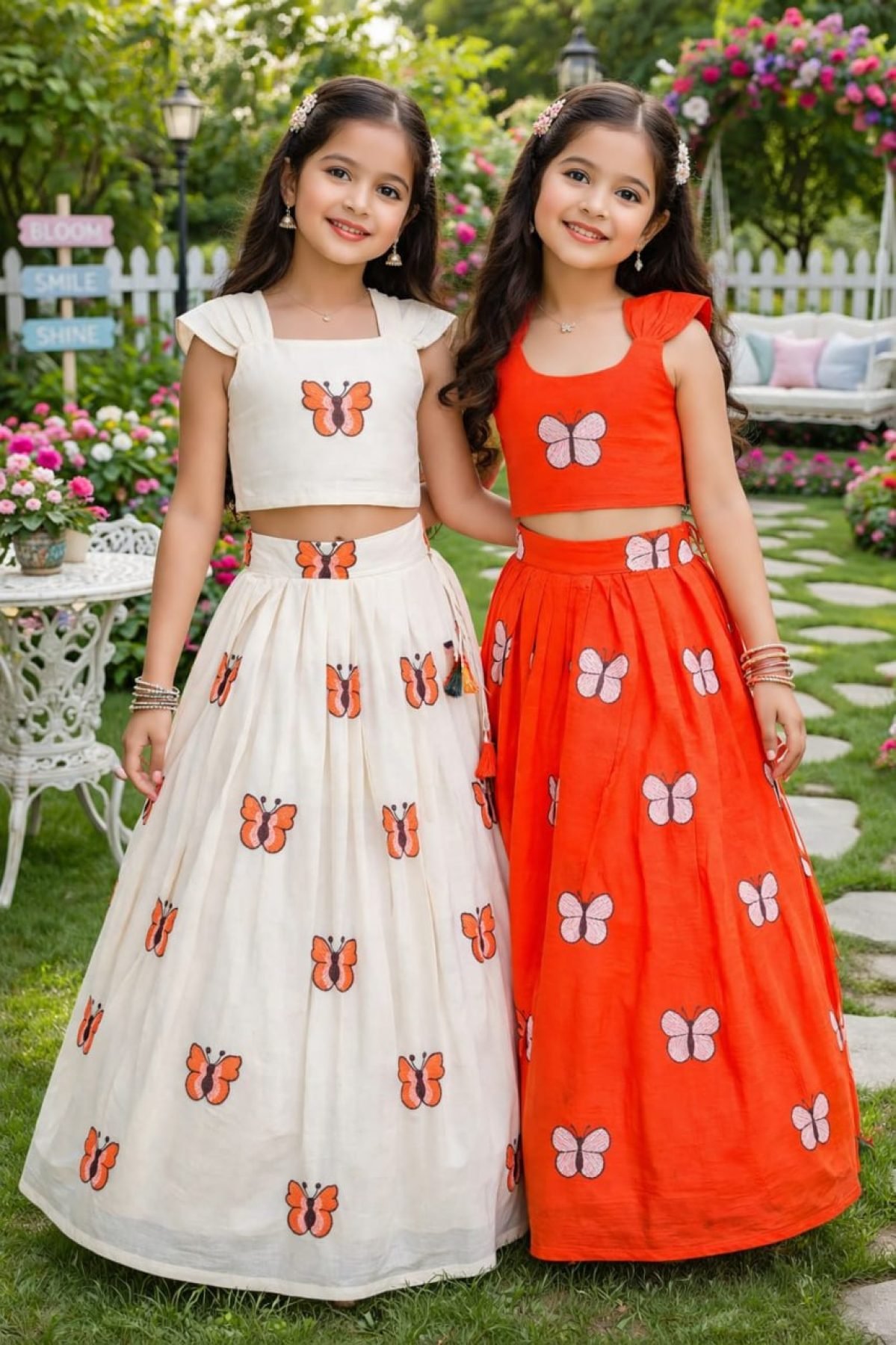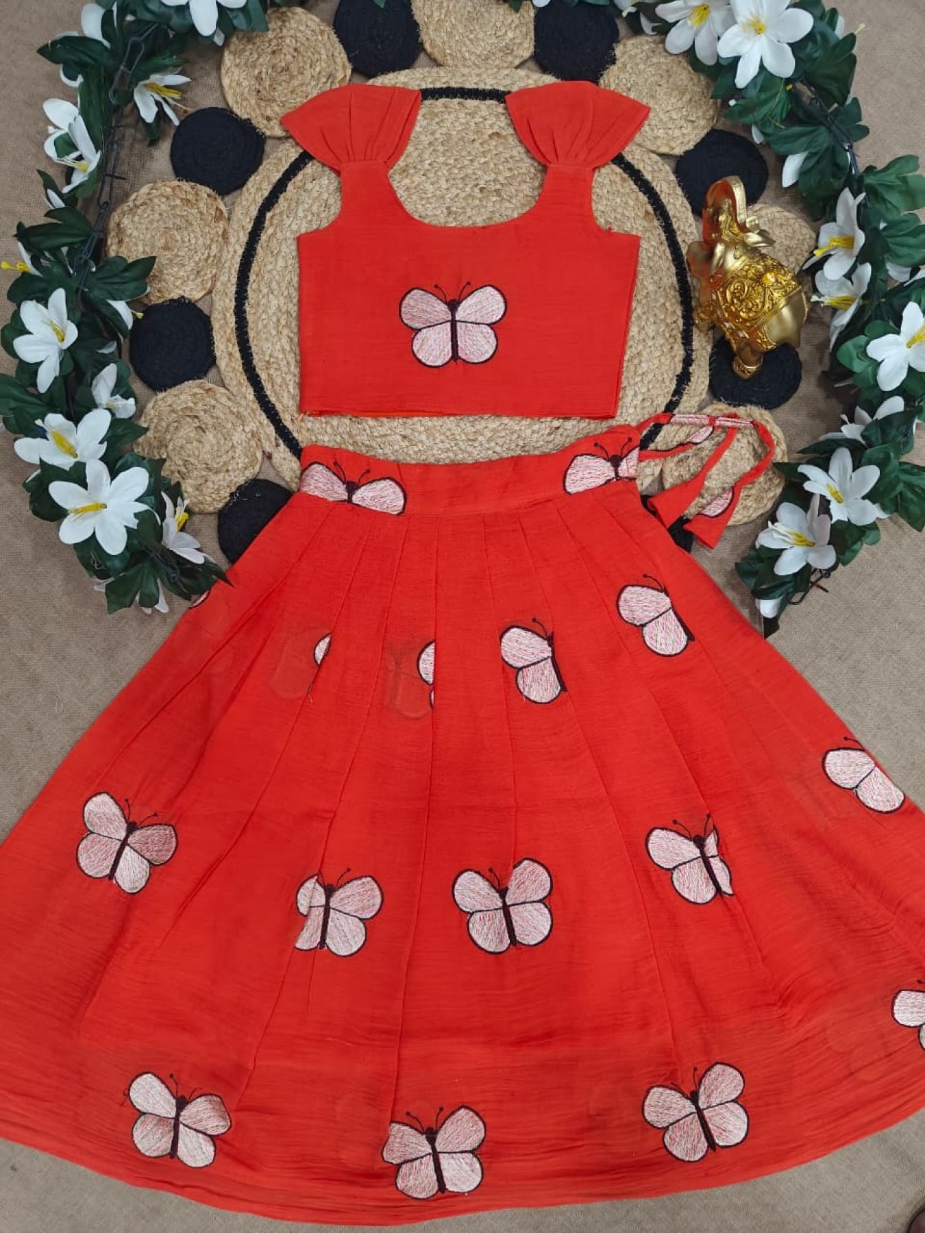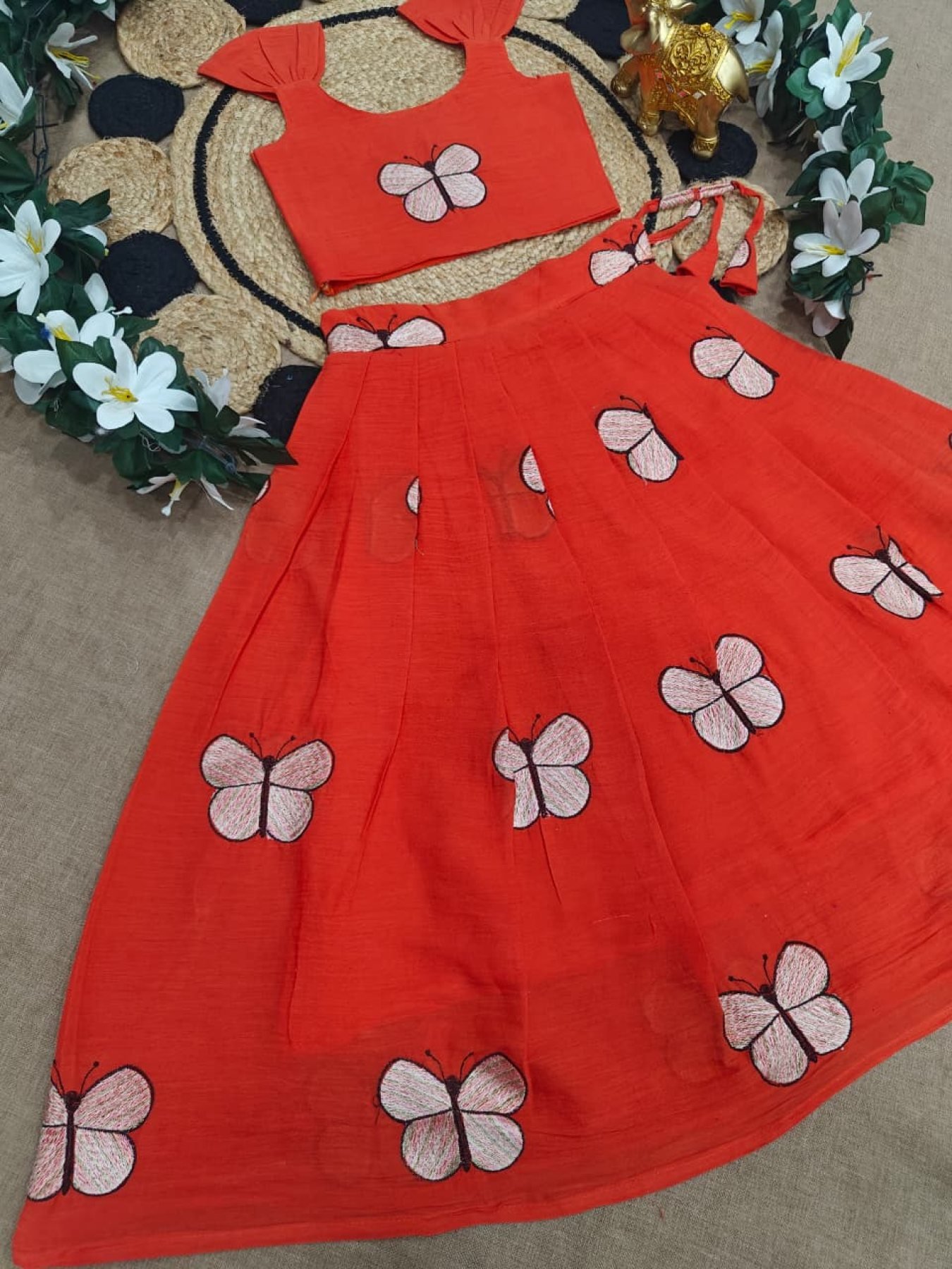 Lightweight cotton kids lehenga set featuring beautiful embroidery with comfortable lining and zip closure blouse. Perfect for summer, festive, and party wear.