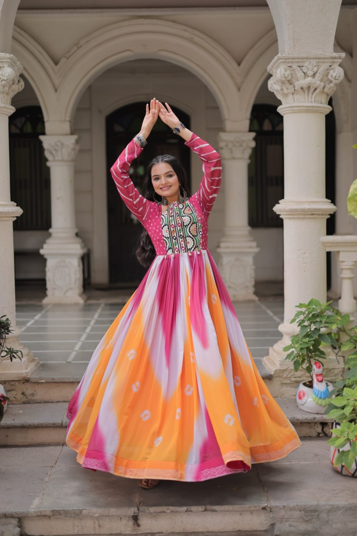 Orange Pink Faux Georgette Bandhej Gown with Gamthi Embroidery Festive Celebration Wear