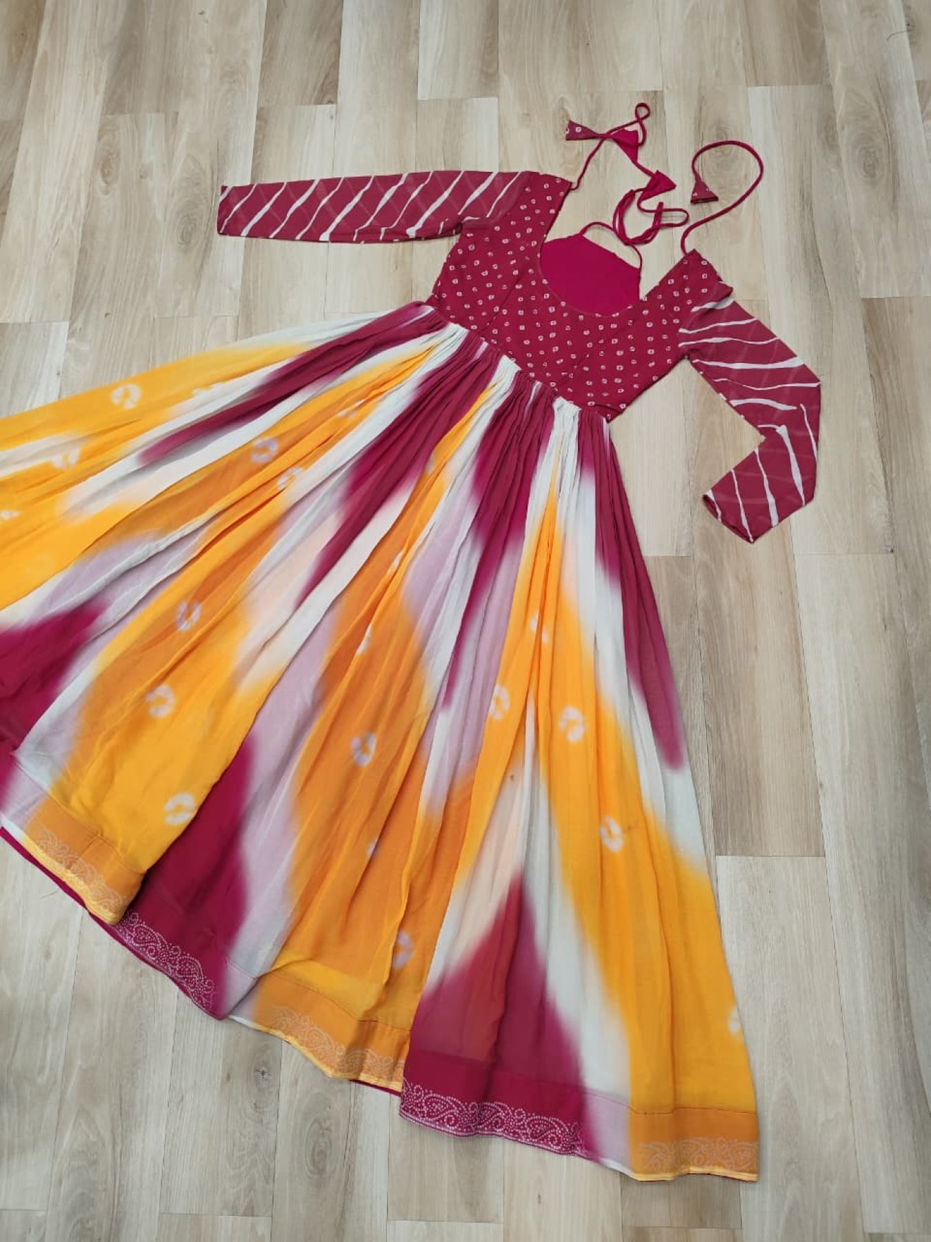 Make a stunning style statement with this Faux Georgette Bandhej Print Gown beautifully designed with Gamthi embroidery and mirror embellishment. Featuring a floor-length silhouette with 4-meter flair, this gown ensures elegance with comfort. Perfect for festivals, weddings, Navratri, and party occasions.