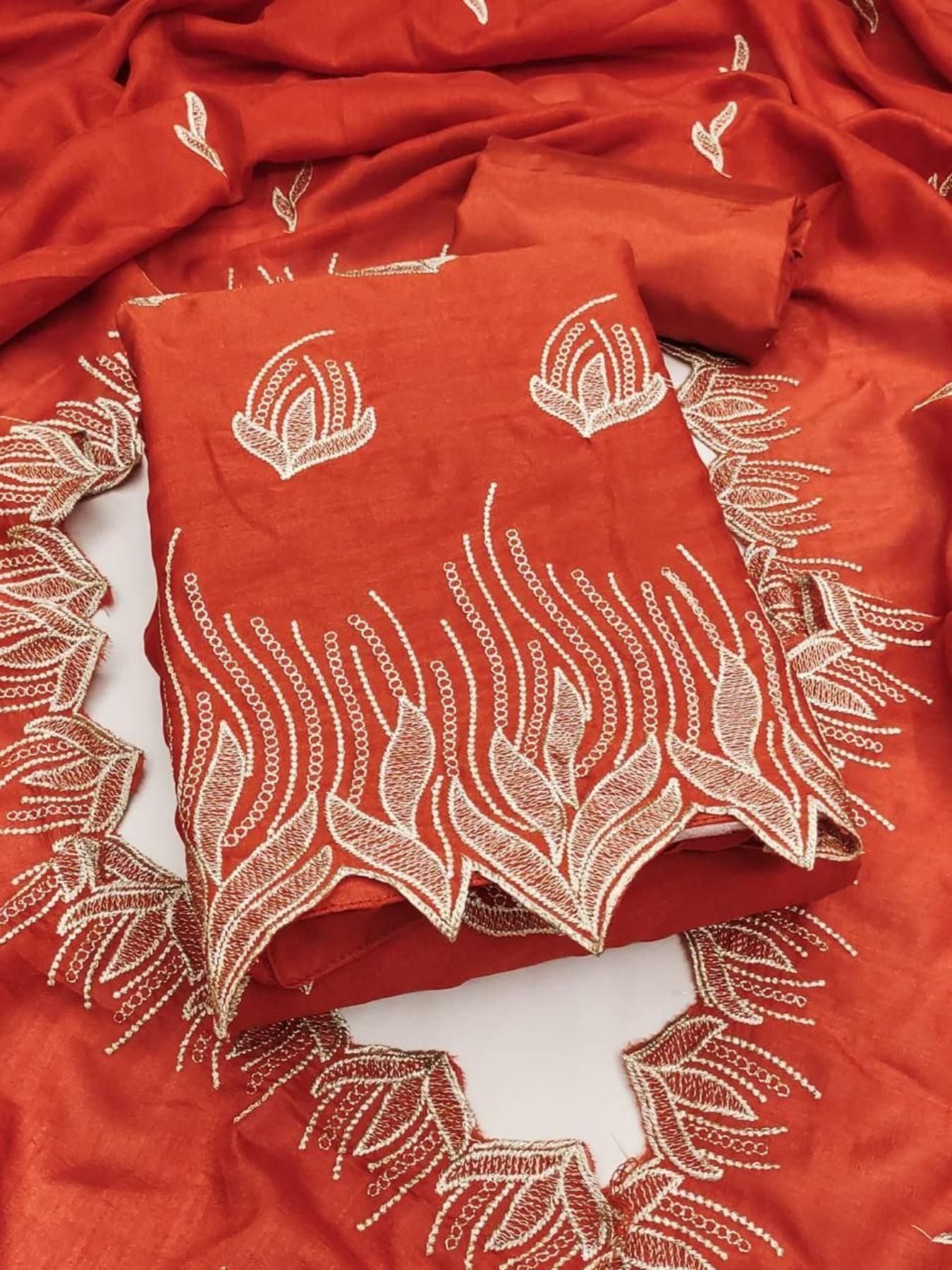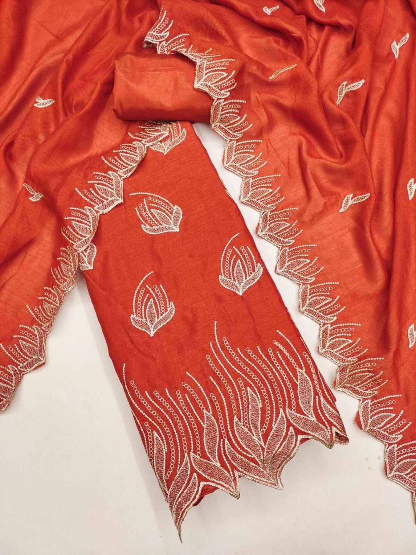 Orange Vichitra Silk Unstitched Dress Material Set Includes a Top And Dupatta