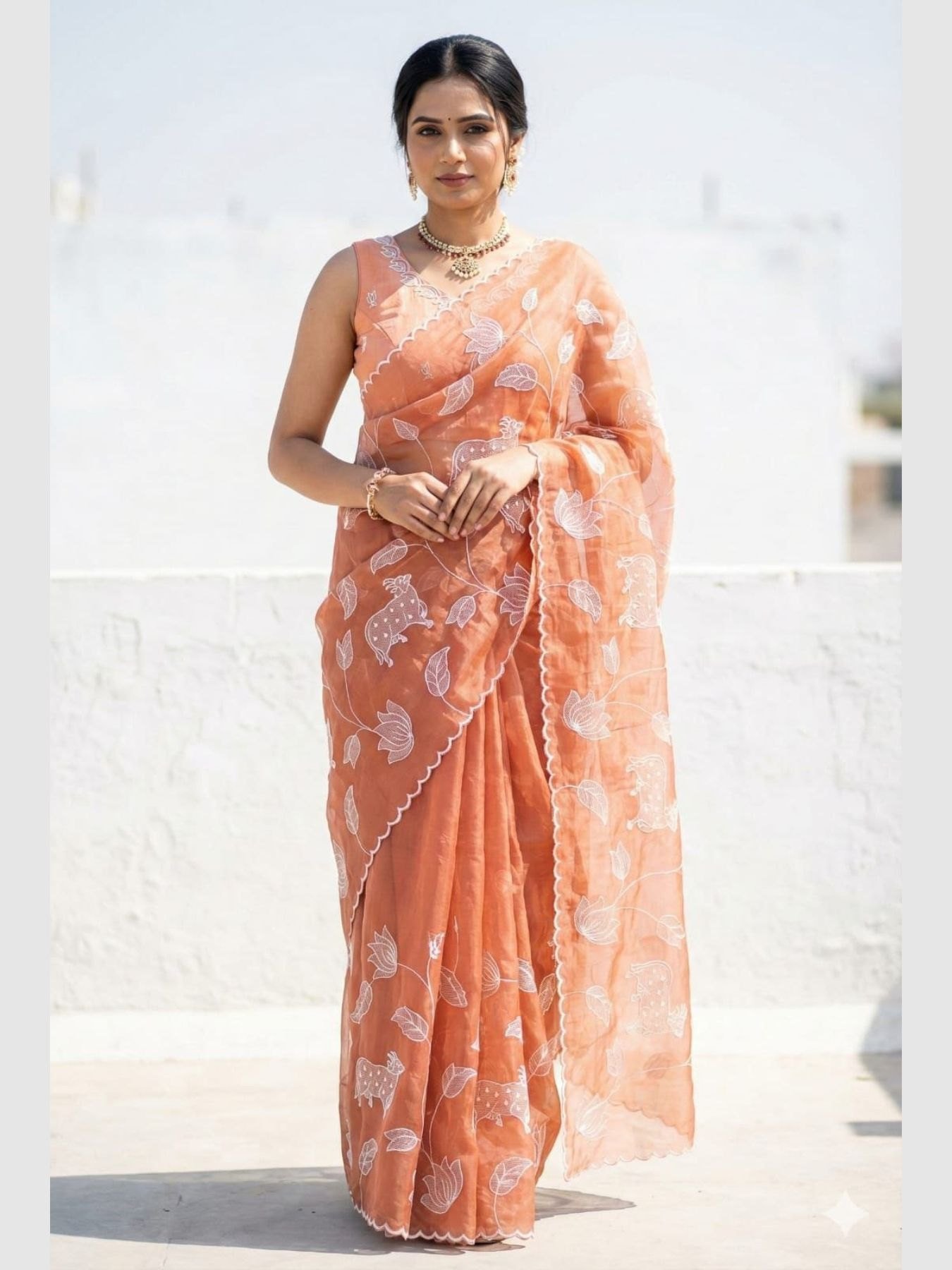 Ornate Orange Soft Gold Crush Saree with Heavy Embroidery for Women