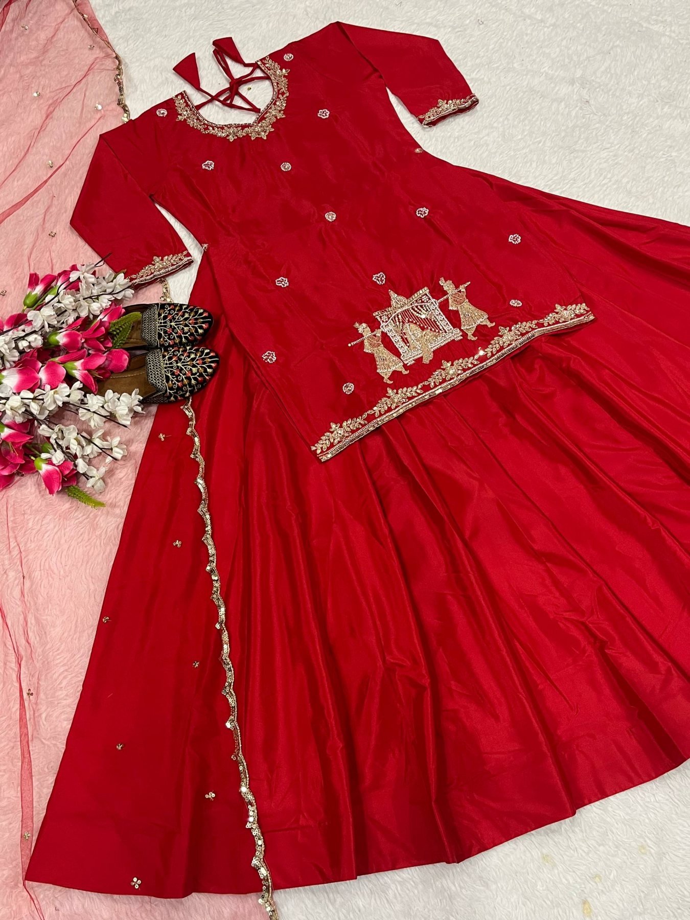 Premium crepe silk lehenga set featuring heavy handwork top with sequins embroidery and zari detailing. Paired with flowing lehenga and net dupatta, perfect for festive and wedding occasions.