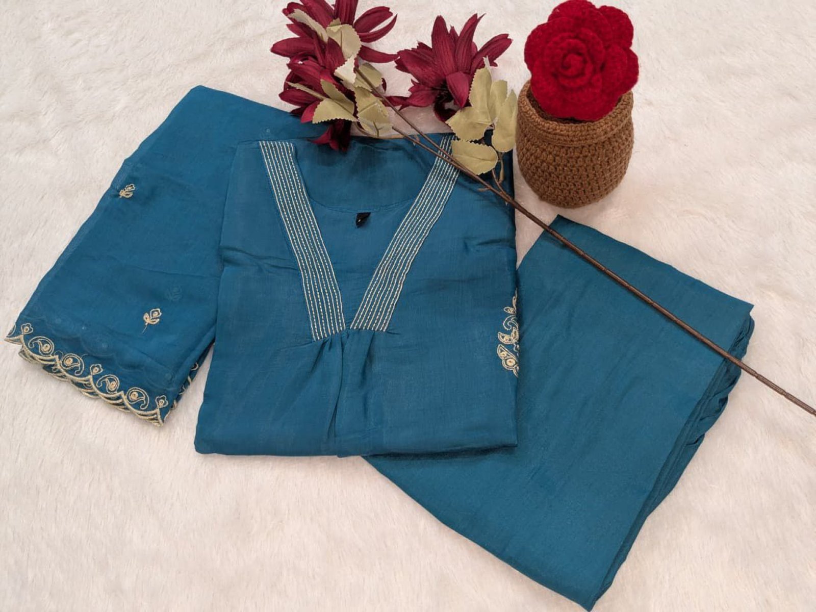Orphina Blue Mul Chanderi Suit with Roman Silk Bottom Summer Style