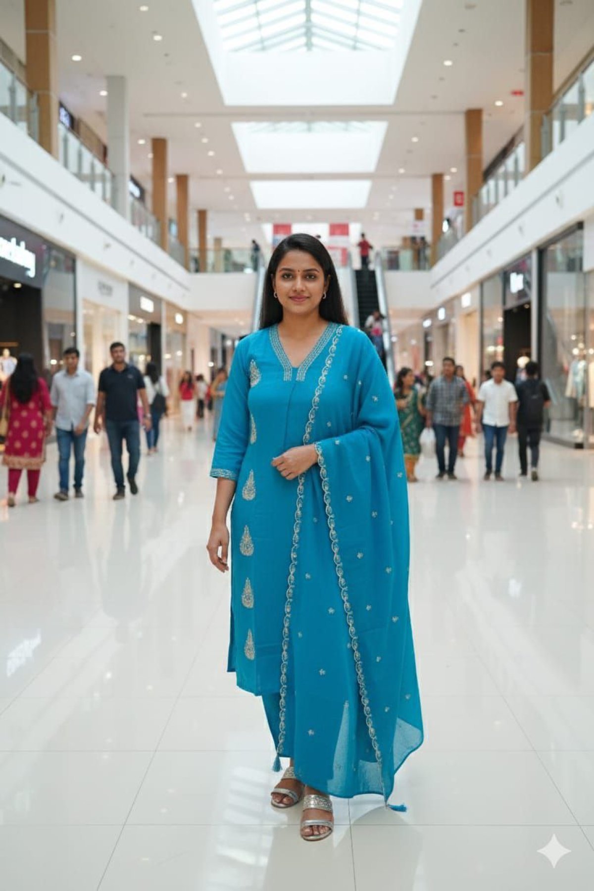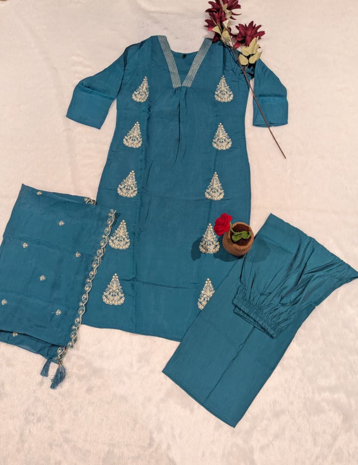 Mul chanderi suit set featuring intricate khata hand work on the top, paired with a smooth roman silk bottom and a lightweight mul dupatta. Perfect for graceful festive and casual ethnic wear.