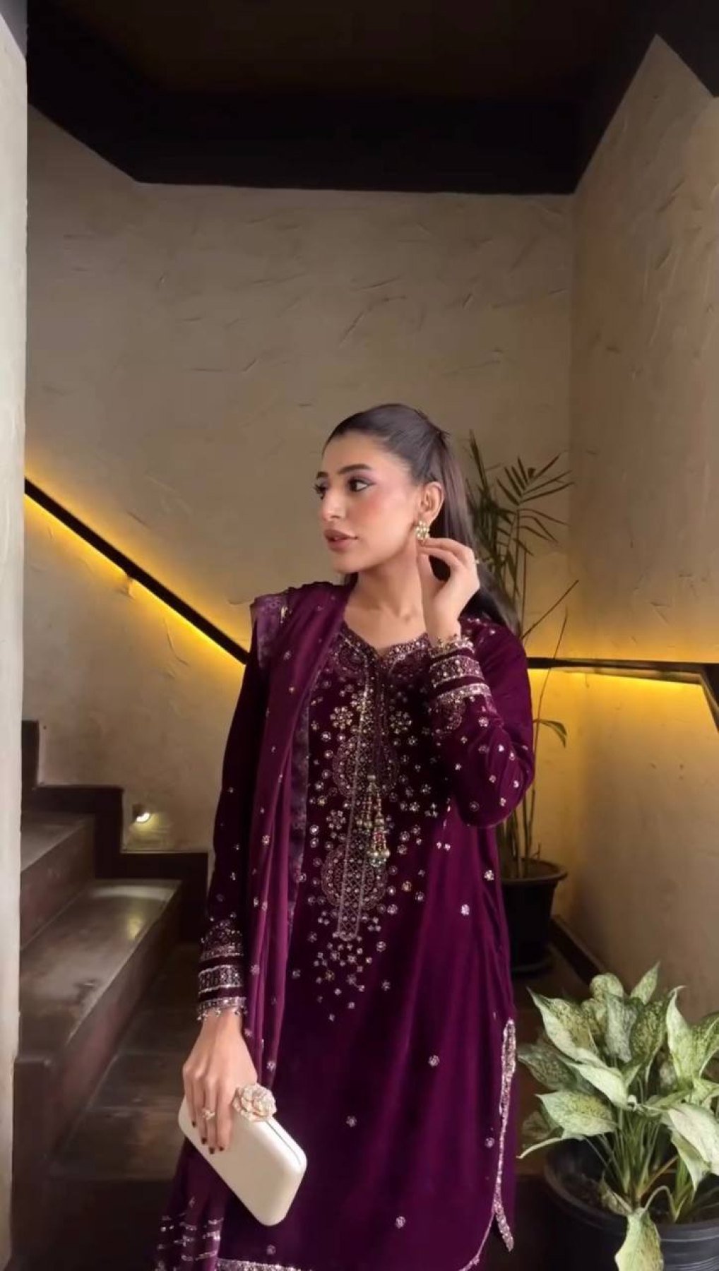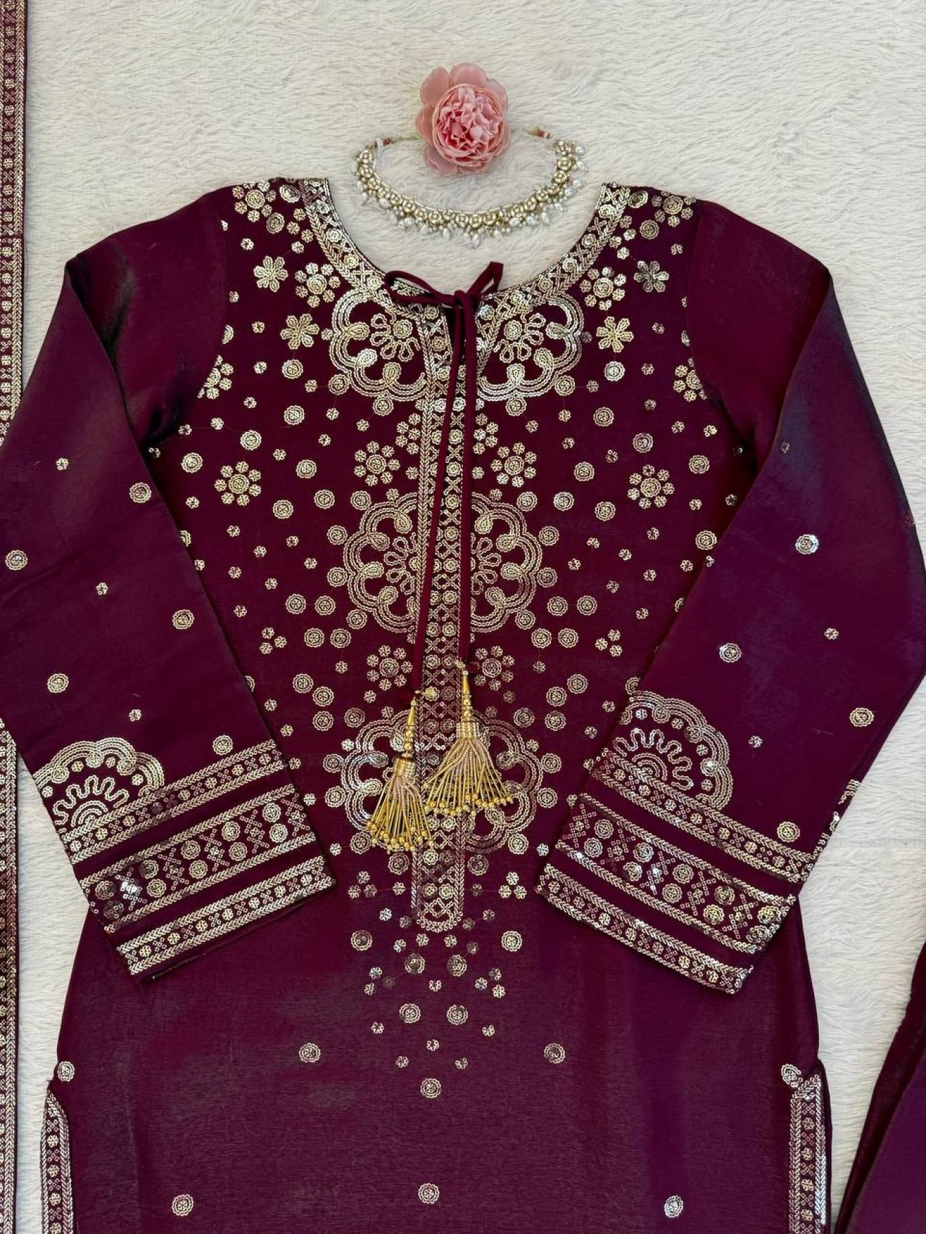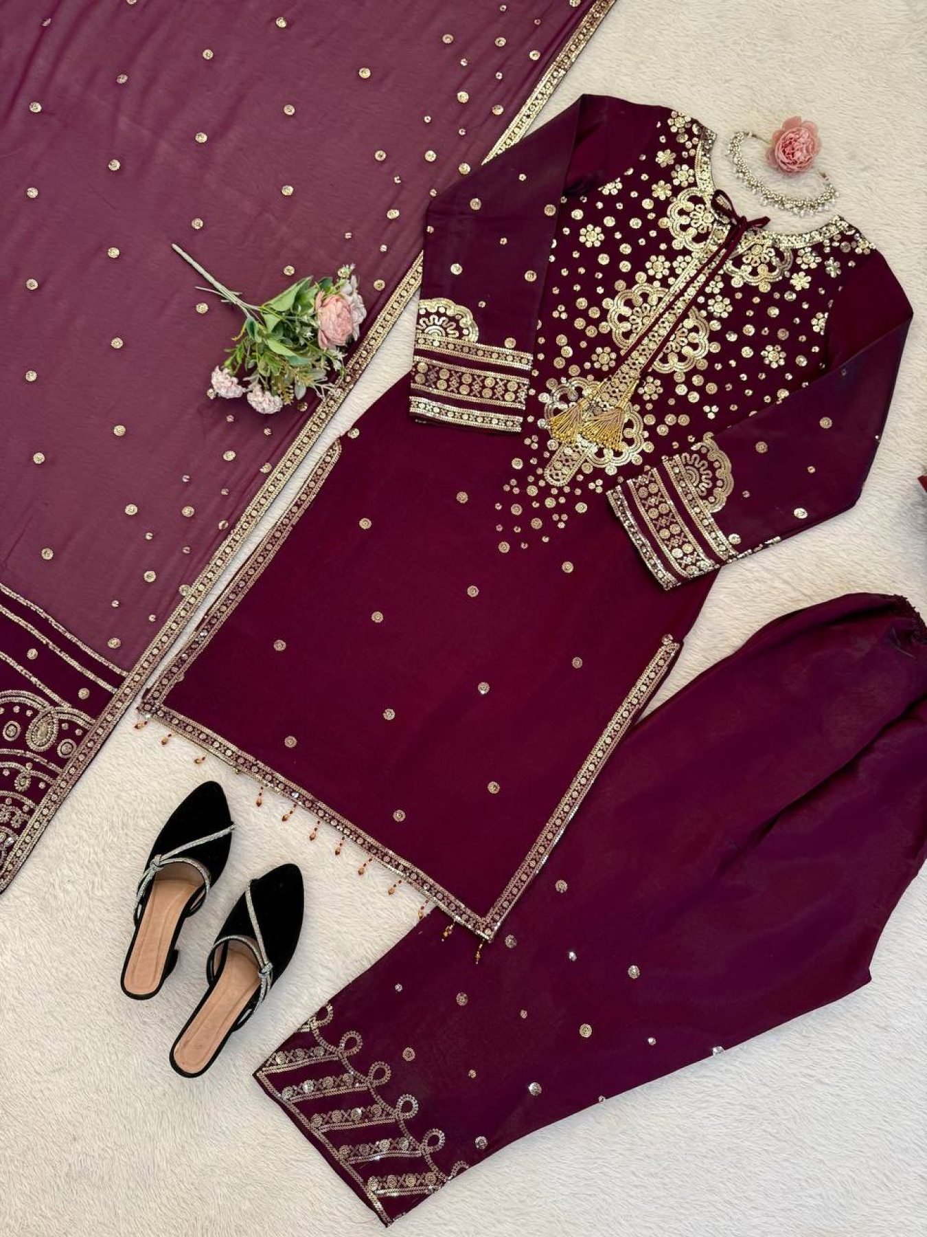 Premium Roman glass suit set crafted with elegant thread and sequins embroidery. Designed for a graceful and modern look, this outfit is perfect for festive occasions, weddings, and party wear.