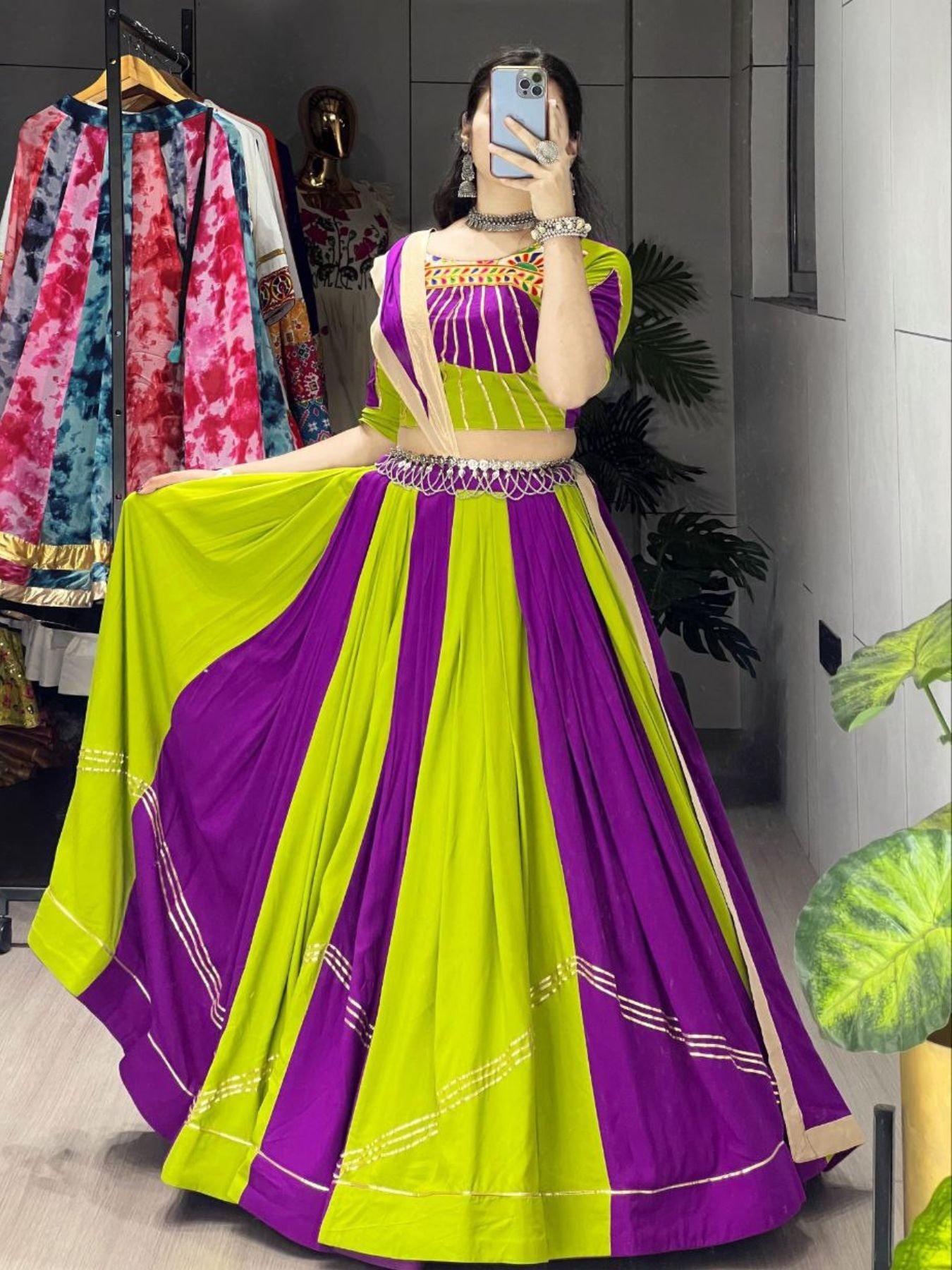 Parrot Green and Purple Rayon Cotton Navratri Chaniya Choli with Gota Patti Border Ready to Wear for Garba Nights