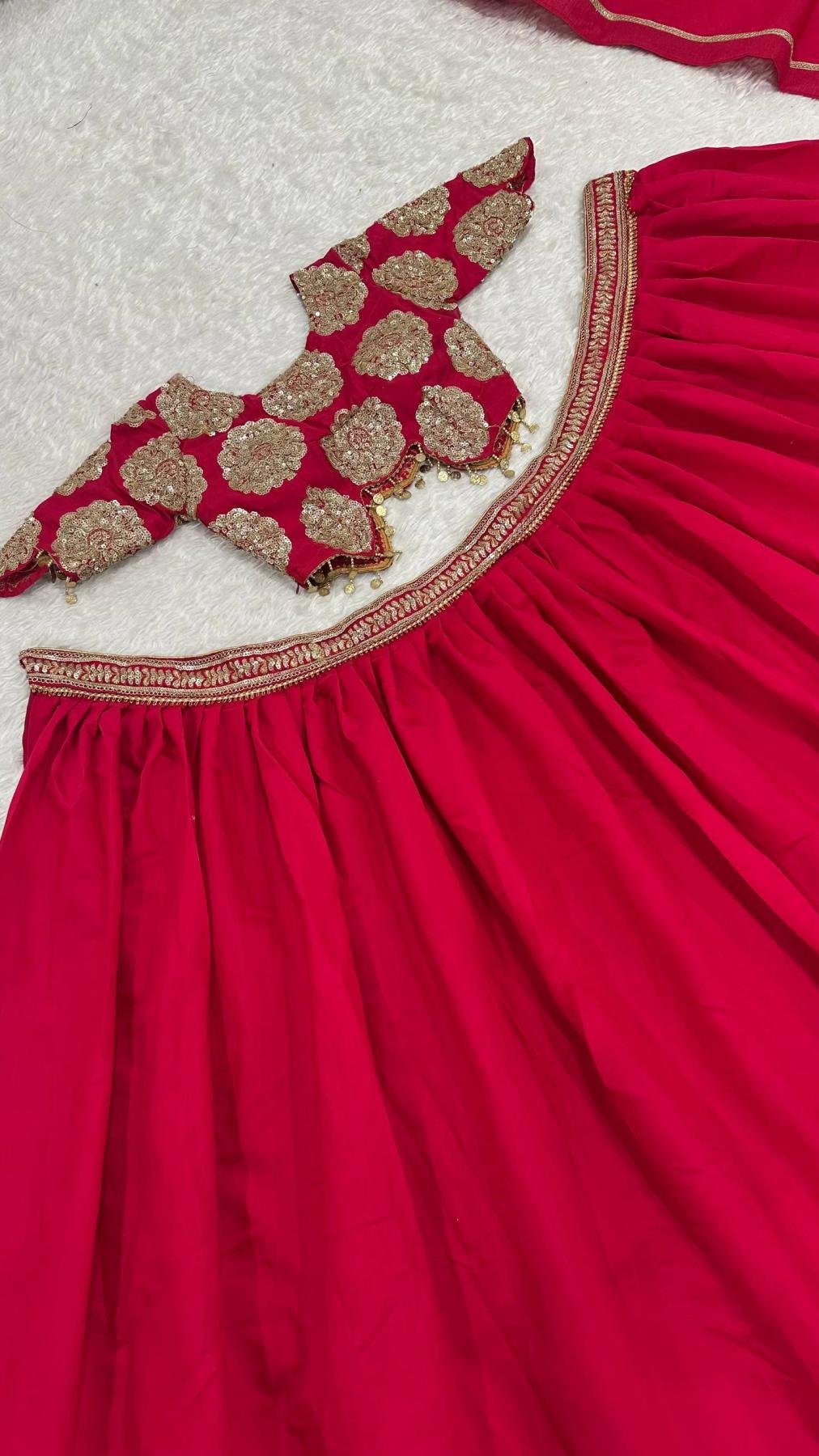 The 3.5-meter flair lehenga with can-can, paired with an embellished dupatta, offers the perfect silhouette for every elegant celebration.