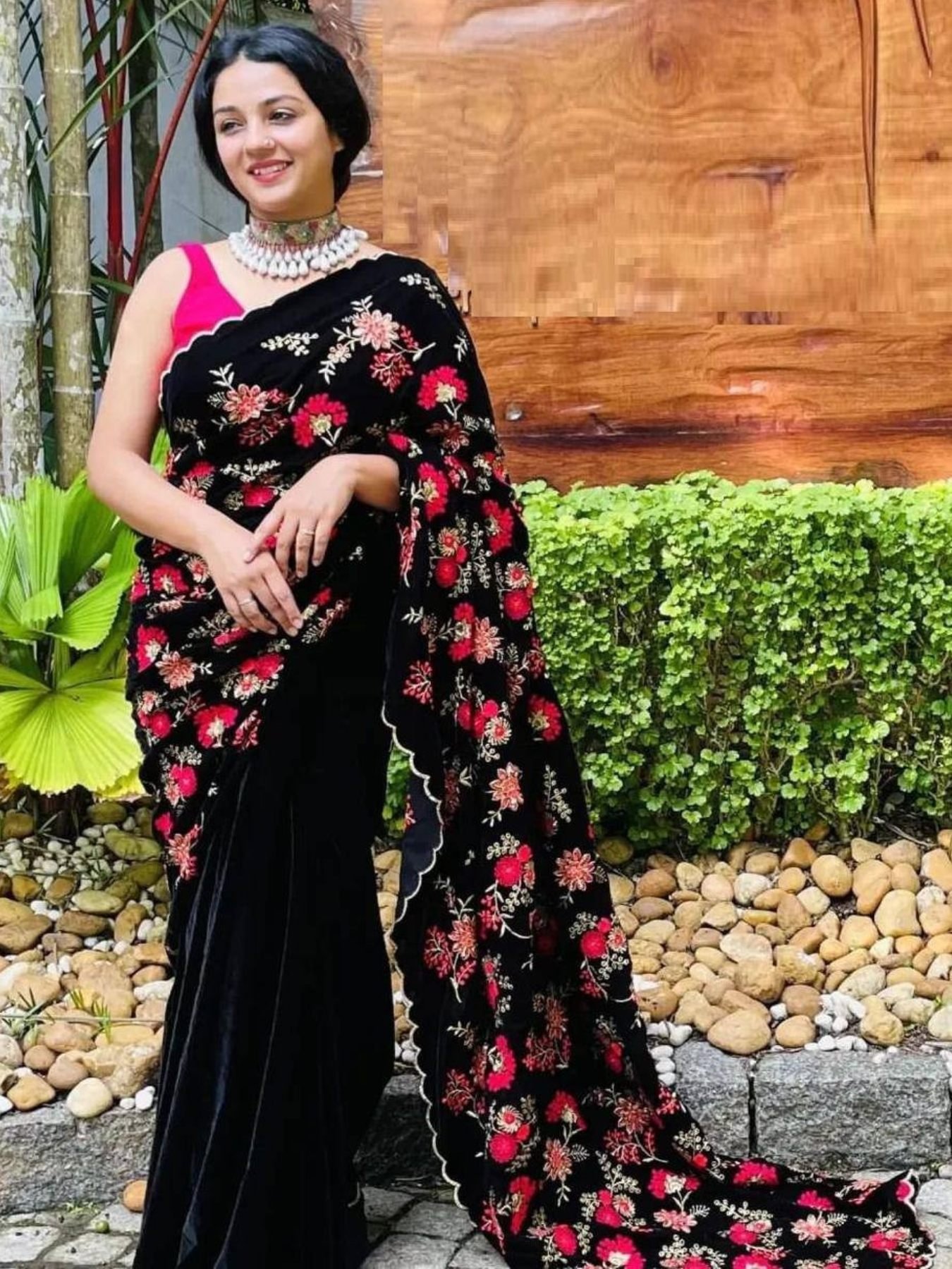 Pary Wedding Wear Black Velvet Wmbroidered Saree