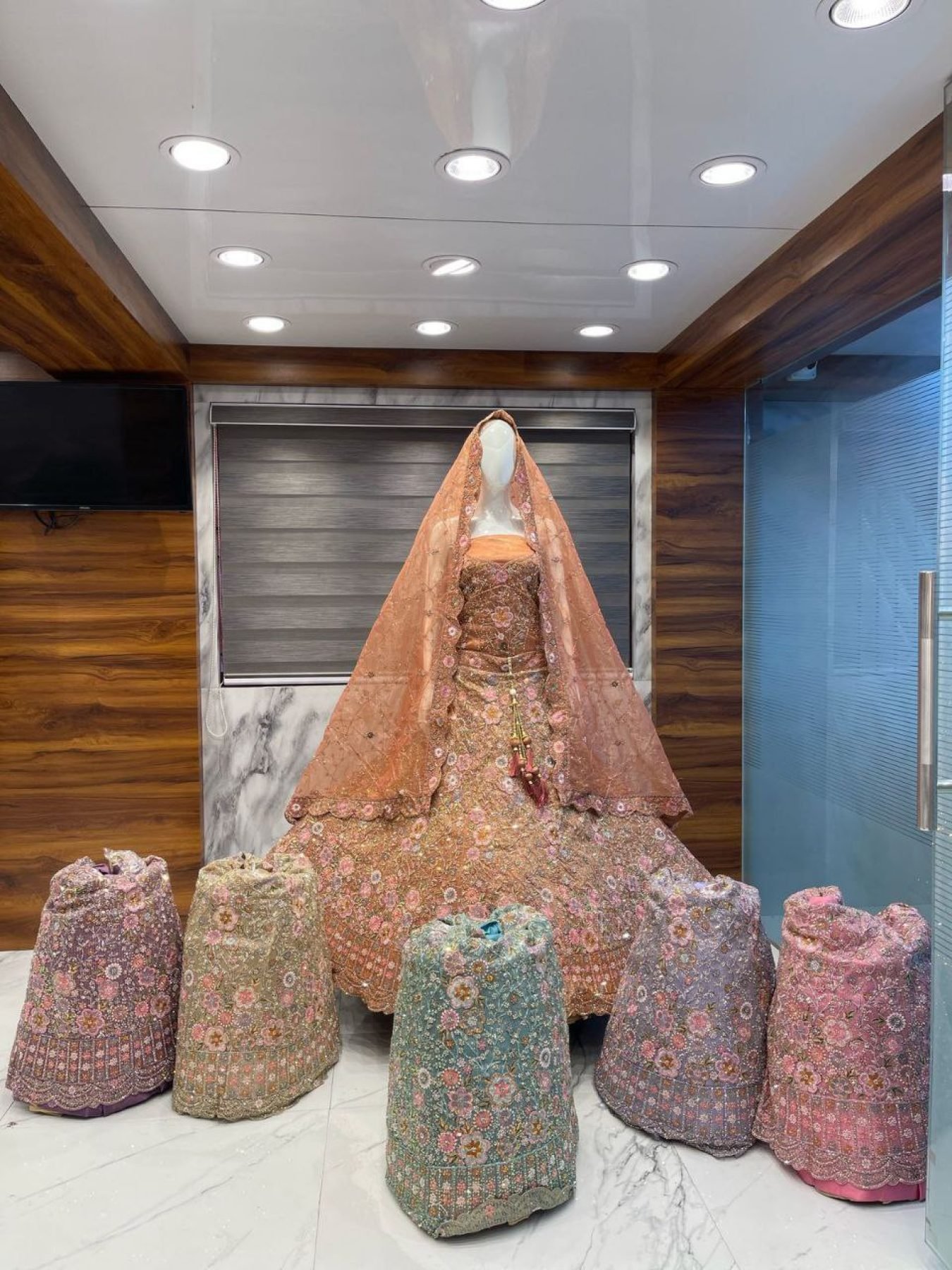 Peach Bridal Lehenga Choli Net Satin Fabric Zari Beads Sequin Detailing Best Price