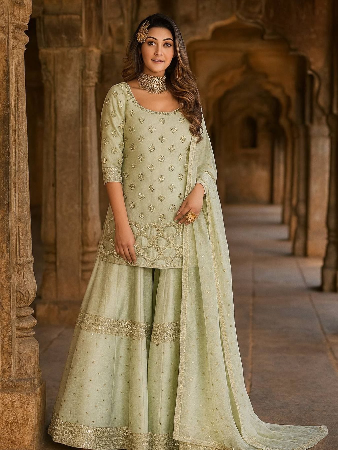 Experience comfort with class in our designer 3-piece party wear set. Crafted in nylon silk with dual-side paper foil work, this outfit pairs a matching palazzo with foil & stone embellishments and a net dupatta finished with stone detailing & fancy border work. Perfectly stitched up to size 42 for a flattering and stylish fit. Ideal for festive events, wedding parties, and cultural celebrations.
