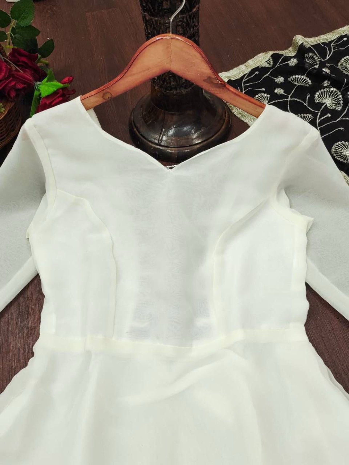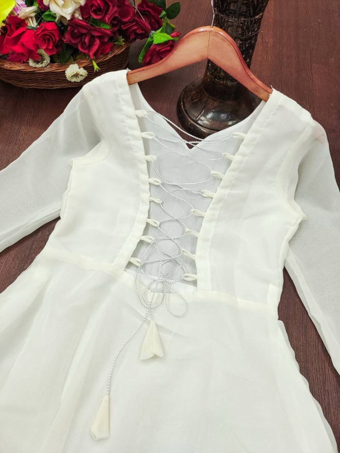 This designer gown is crafted in premium georgette with beautiful embroidery work. Soft crepe inner ensures comfort and perfect fall. Comes with matching georgette dupatta, ideal for festive and party wear.