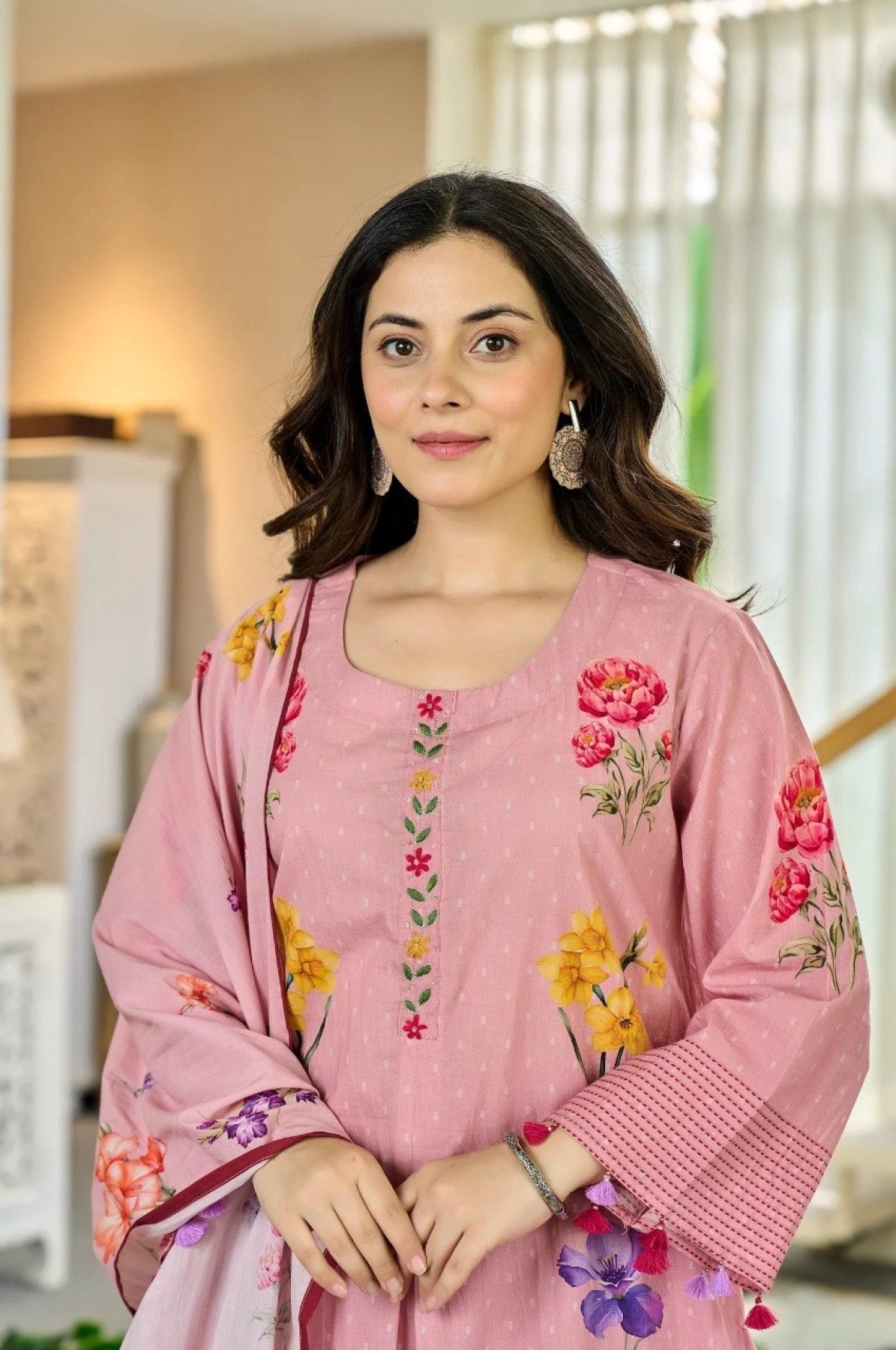 Elegant Chanderi Butti kurta set featuring printed design with matching Chanderi bottom and printed muslin dupatta. Lightweight and graceful outfit perfect for festive, office, and daily ethnic wear.