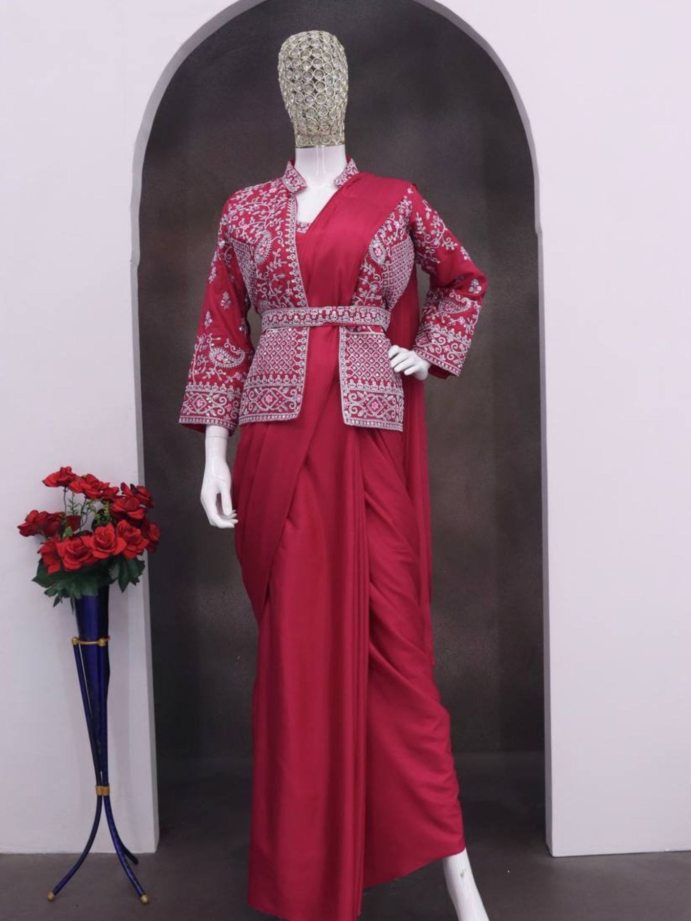 This ready to wear heavy crepe silk saree comes styled with a fully stitched embroidered jacket (koti), creating a modern yet traditional party look. Paired with a stitched satin crepe blouse, it offers comfort, elegance, and ease of wear. A perfect choice for weddings, parties, festive events, and premium boutique collections, supplied at manufacturer pricing for wholesale and export buyers.