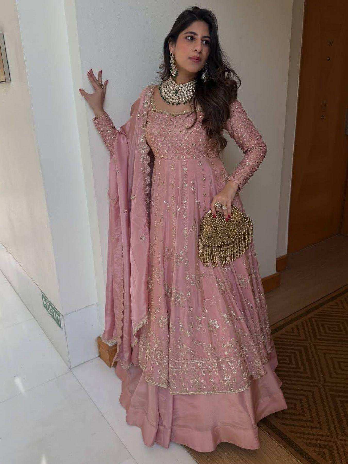 Pink Embroidered Chinon Silk Lehenga with Gown and Dupatta from Manufacturer