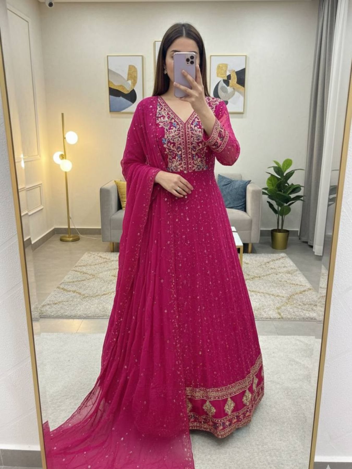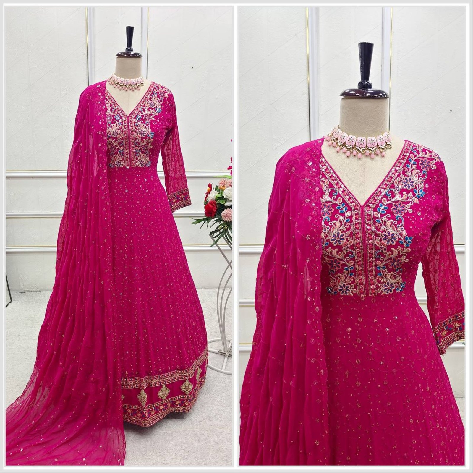 Introducing a graceful Anarkali gown style stitched set in a soft pink color, designed using pure georgette fabric with heavy 3 mm sequin embroidery. The gown features a rich flare and attached pad for enhanced fitting and comfort. This elegant ensemble is ideal for festive wear, wedding functions, and high-demand wholesale and reseller markets.