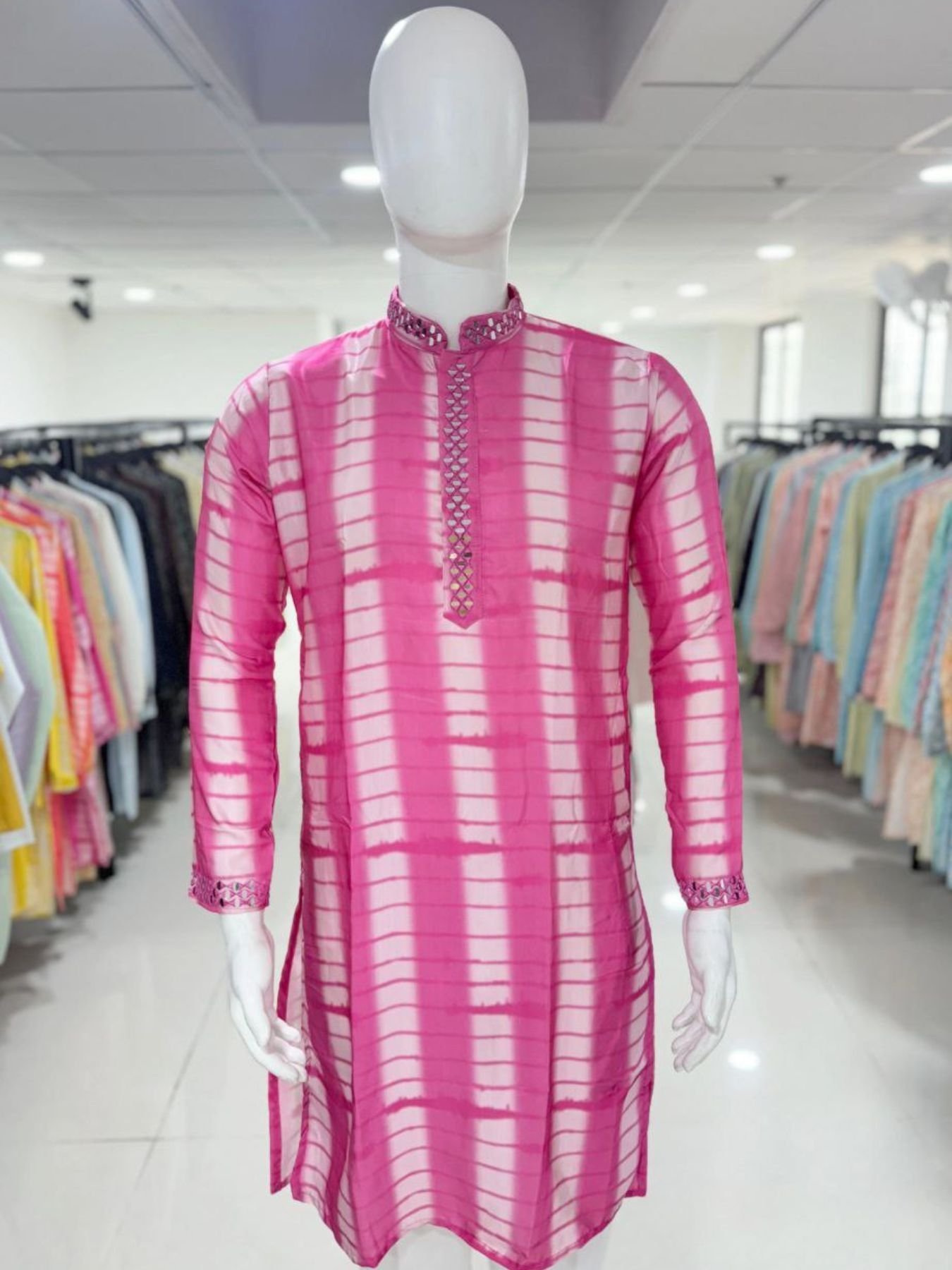 Upgrade your ethnic wardrobe with this luxurious Royal Silk Kurta Pajama set. Designed with stylish mirror work on the neckline, this knee-length kurta offers a regular fit with full sleeves for a perfect blend of tradition and elegance. Ideal for festivals, weddings, receptions, or cultural events.