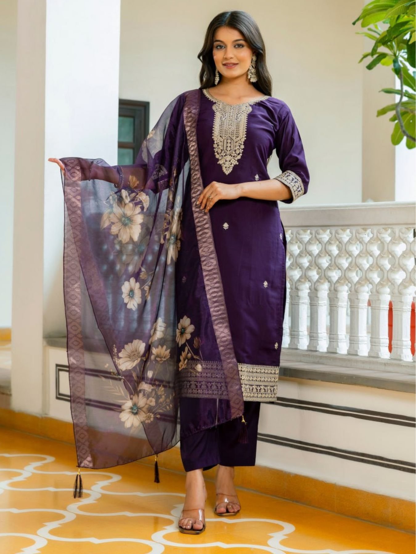 Premium viscose chanderi suit set crafted with elegant embroidery for a rich festive look.