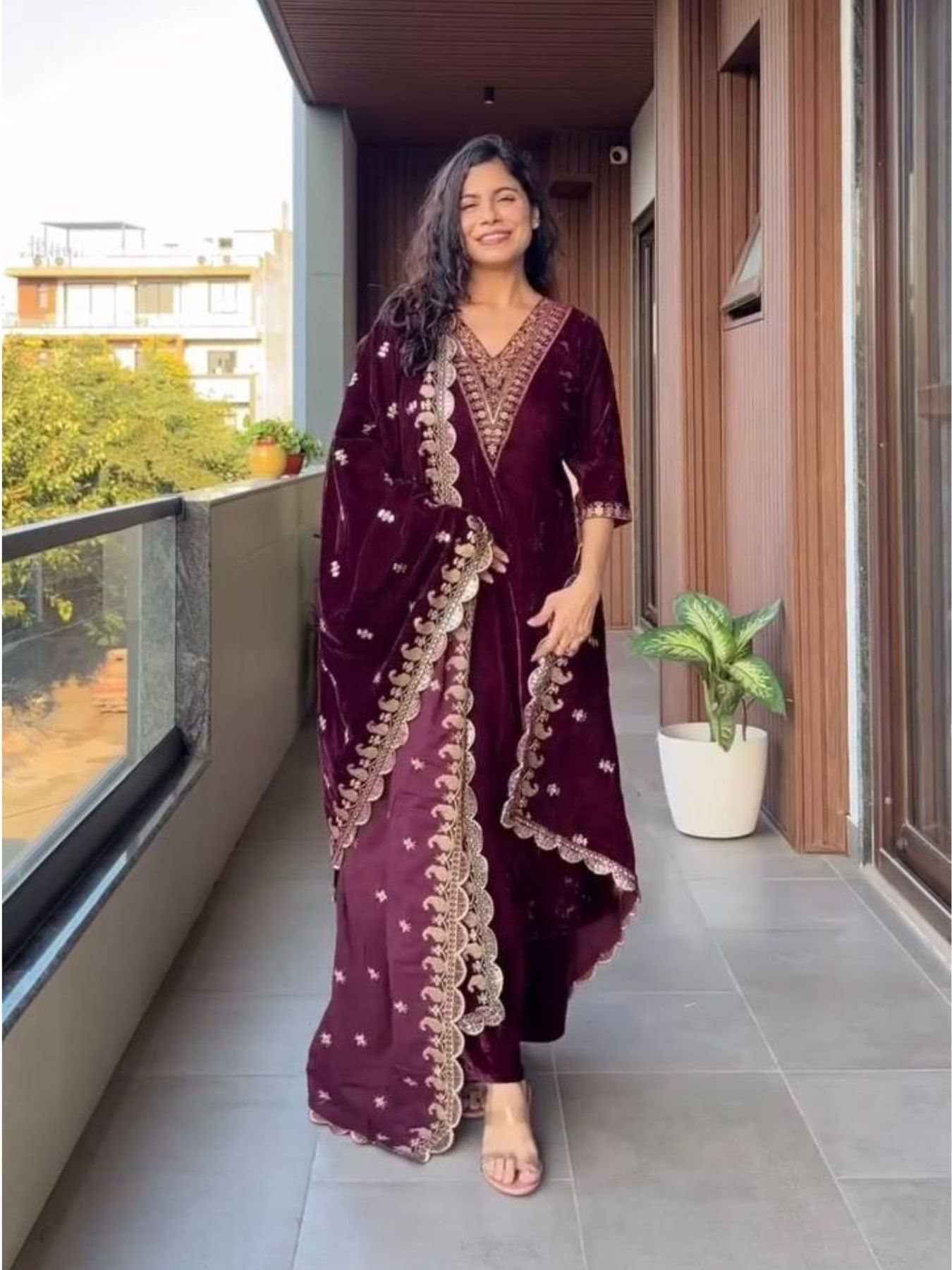Experience luxury with this fully-stitched velvet kurti paired with a matching velvet pant for a rich festive look.