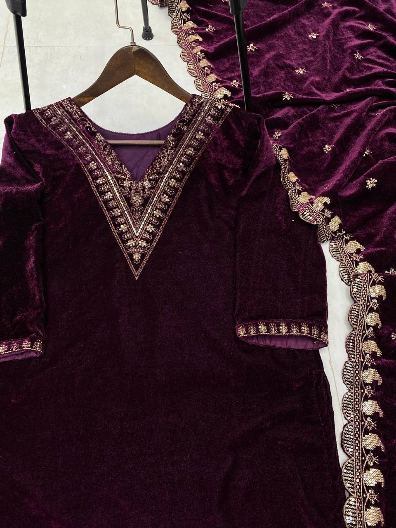 Plum Purple Velvet Sequence Embroidered Kurti Pant Set with Heavy Velvet Sequins Dupatta for Festive Wear