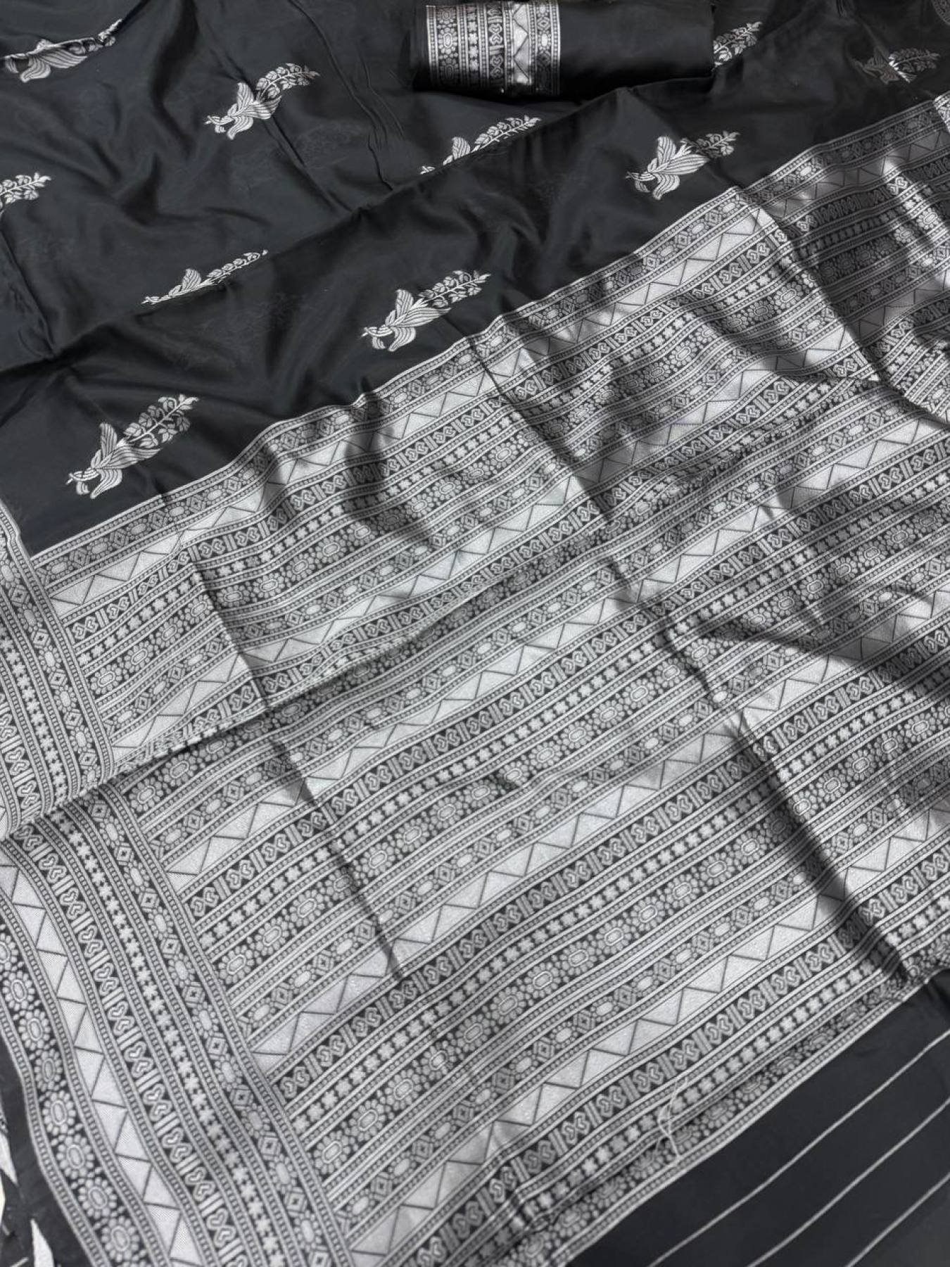 Woven with intricate Jacquard weaving patterns and paired with a contrast blouse, this saree redefines luxury for weddings, festive functions, and celebrity-style occasions.