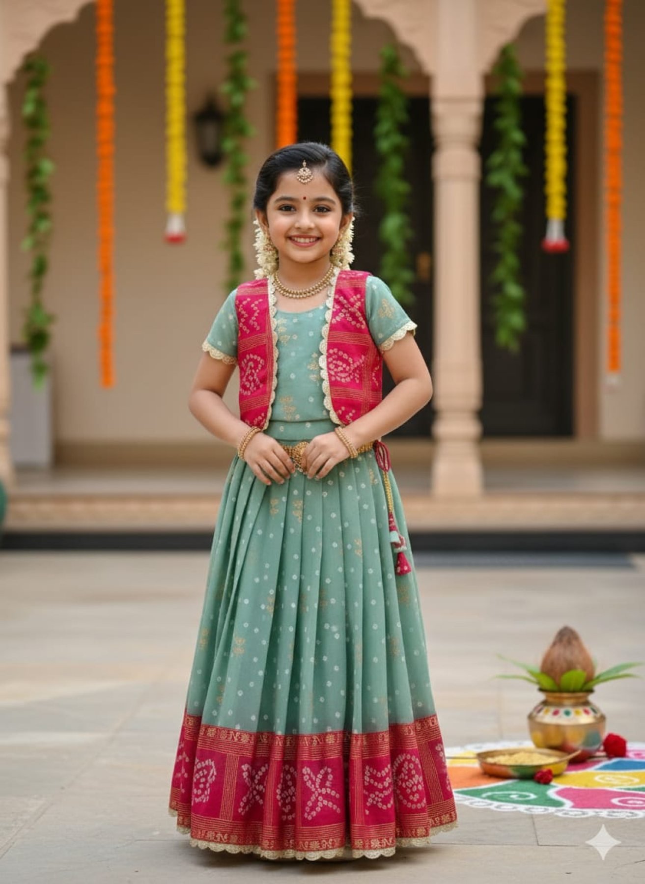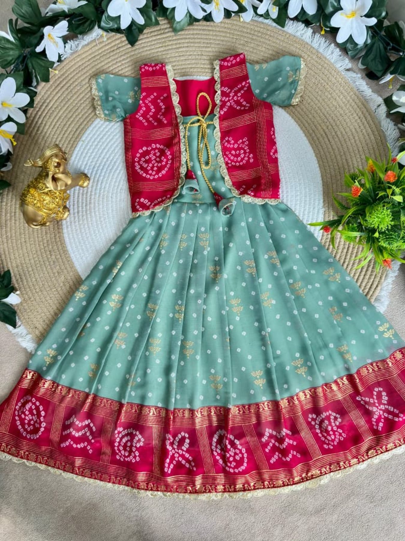 Beautiful Bandhani silk kids outfit featuring foil print work, available in gown with coat or lehenga choli with dupatta option. Designed for festive and traditional occasions with comfort and style.