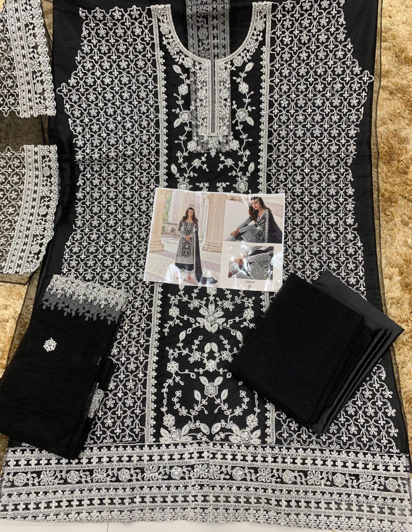 This semi-stitched designer suit features rich butterfly net fabric with exquisite embroidery, giving a luxurious festive look. The Japan satin inner enhances comfort and adds a graceful fall. Paired with a butterfly net dupatta and matching bottom material, it is perfect for weddings, engagements, and partywear orders.