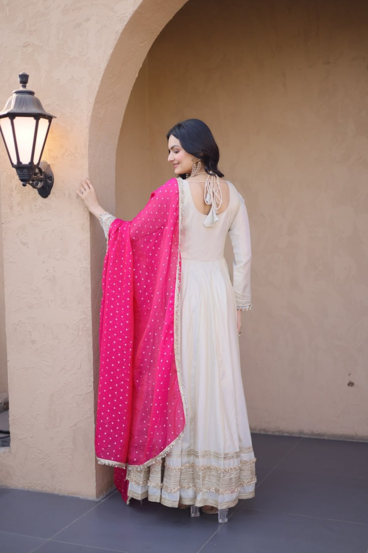 Premium cosmos gown featuring real mirror work with zari lace embroidery and elegant kali flare. Paired with woven dupatta, perfect for weddings and festive occasions.
