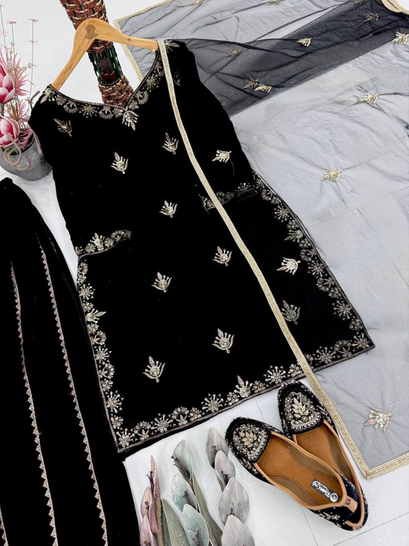 Luxurious viscose velvet top and sharara set detailed with heavy both-side sequence embroidery for a royal festive look.