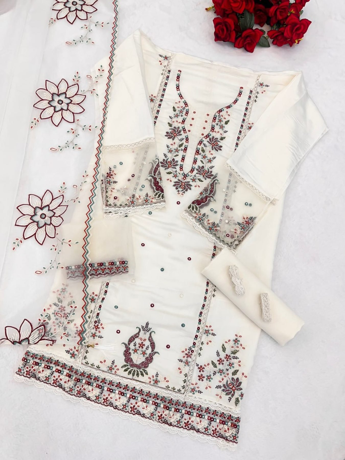A premium organza silk dupatta completes the outfit, making it perfect for festive, party, and wholesale export buyers.