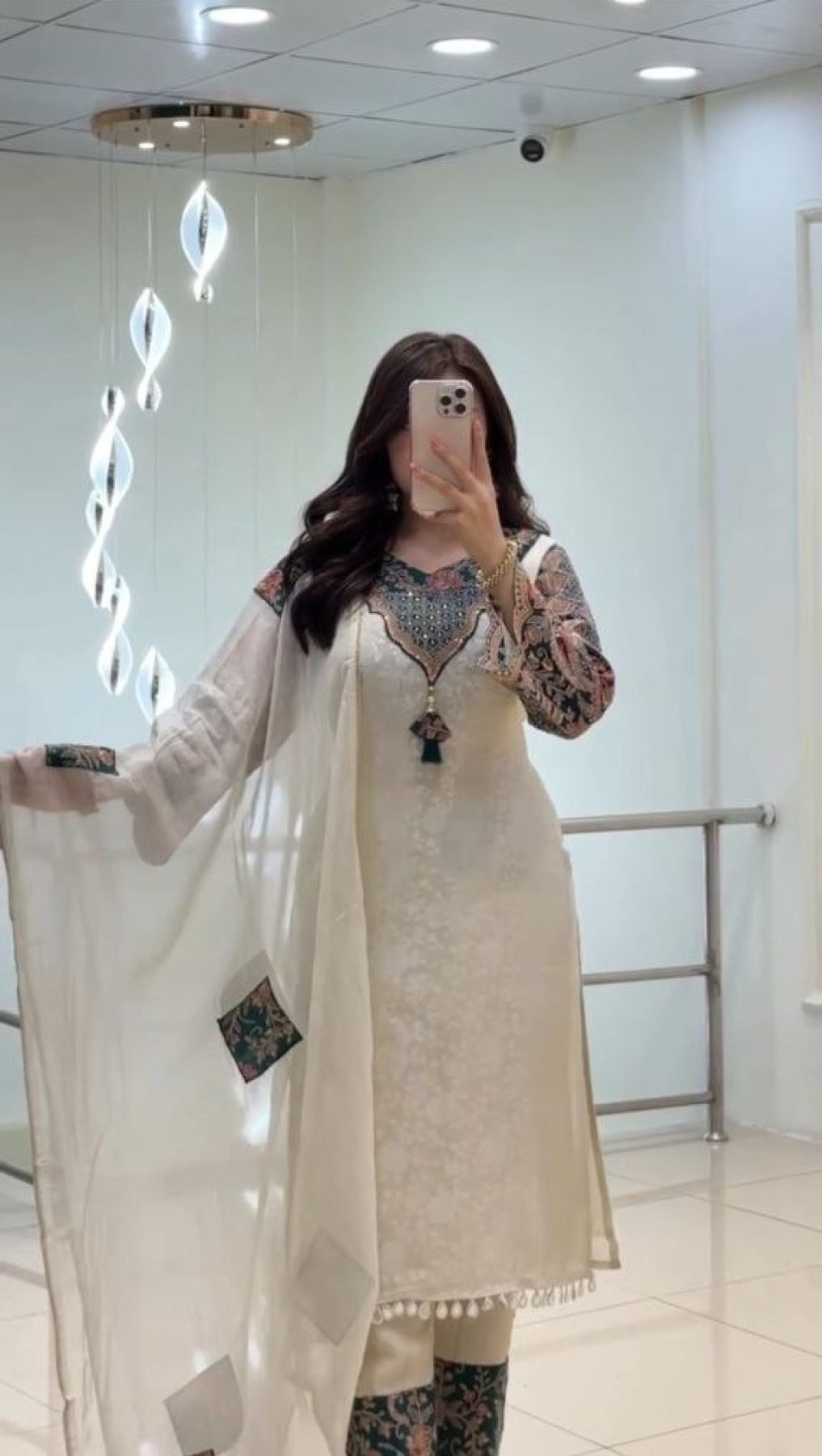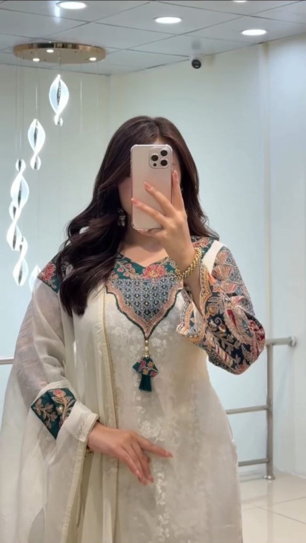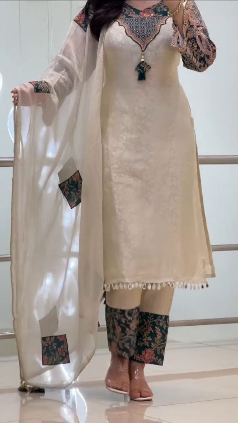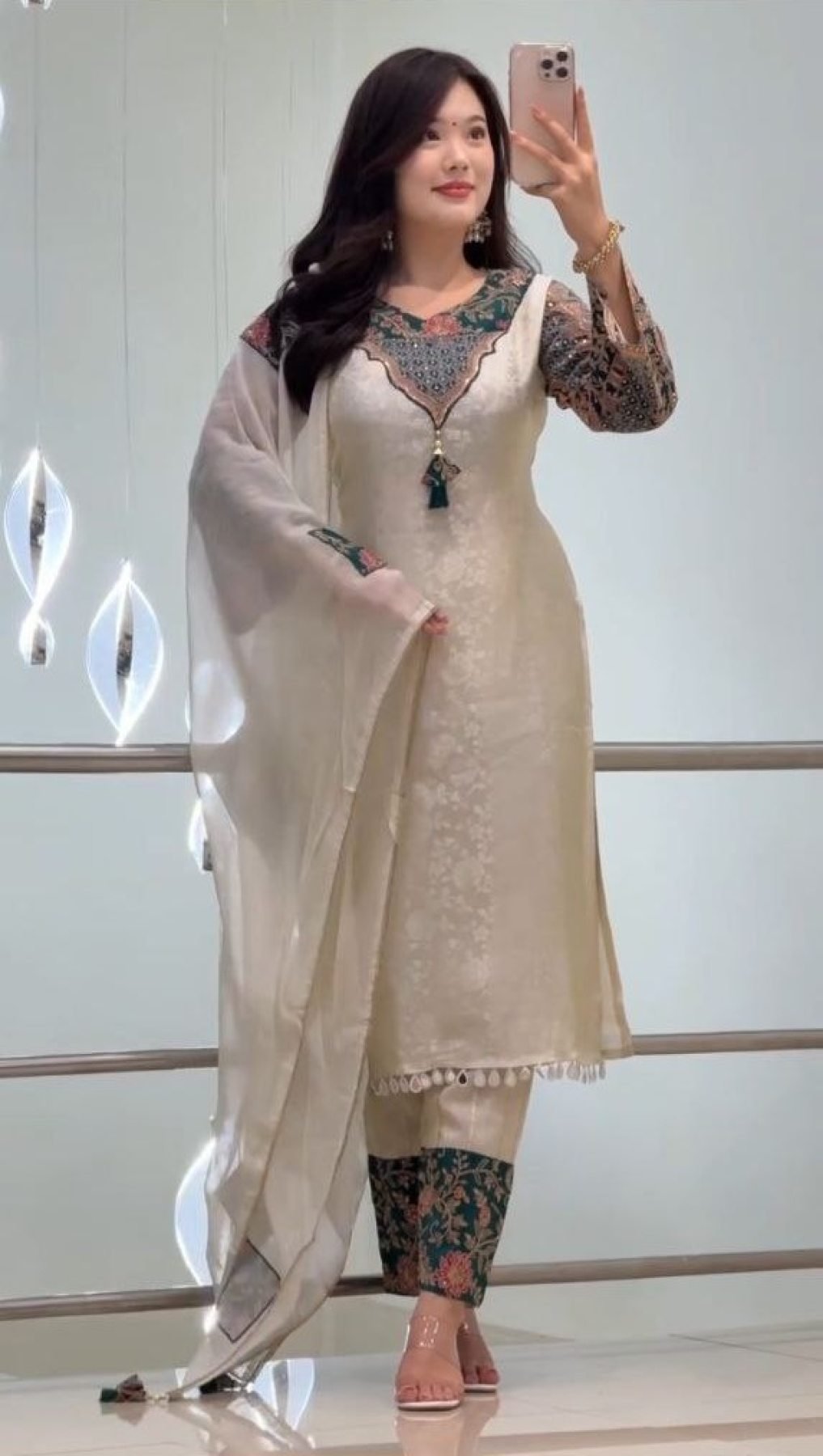 Premium Cream Banarasi Ethnic Set with Handwork Neck and Designer Dupatta For Occasions