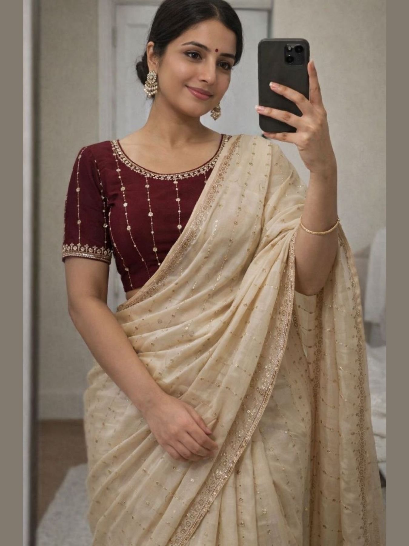 Premium Cream Star Georgette Saree with Sequence Work for Party Wear