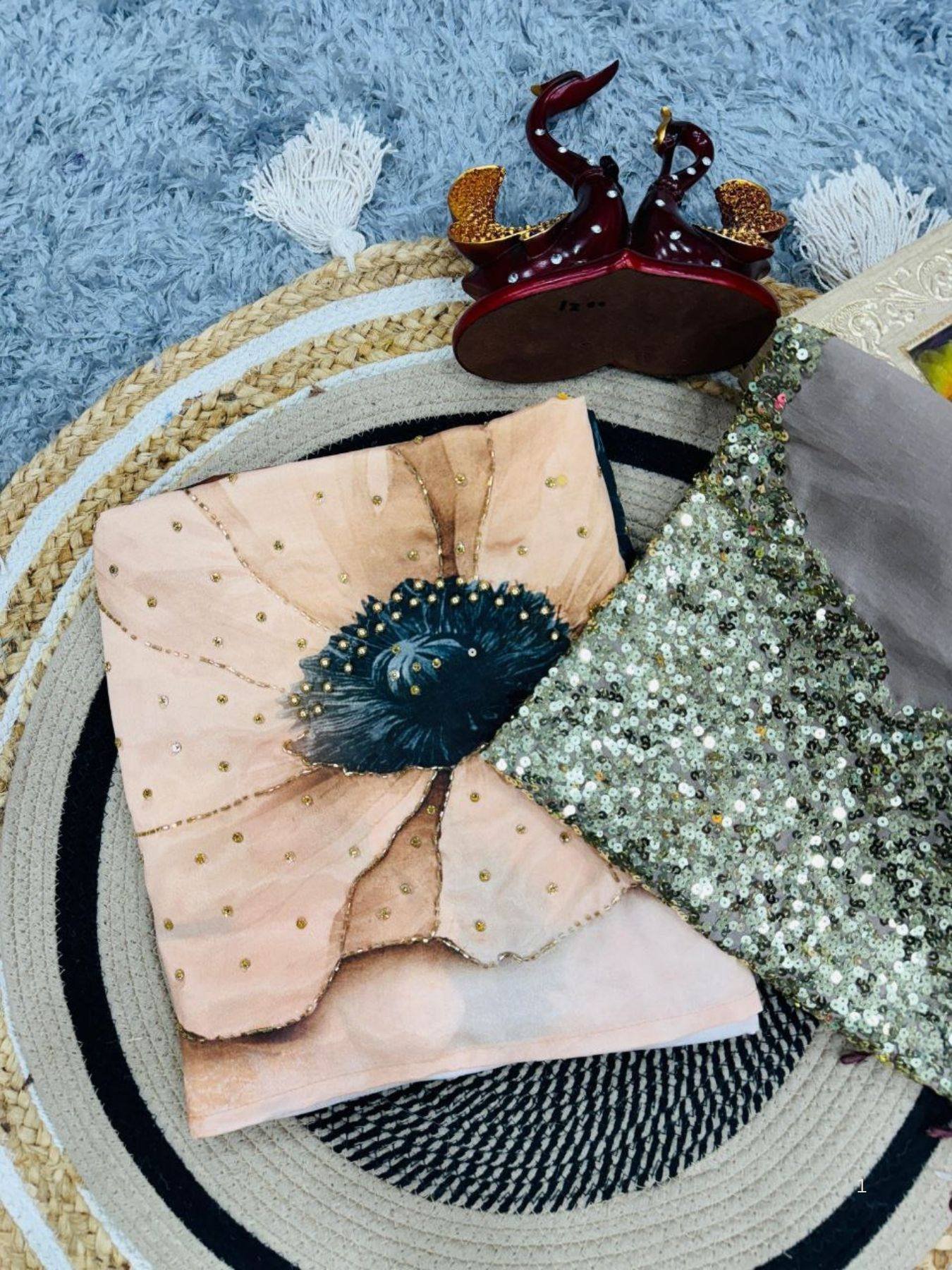 Premium Floral Printed Satin Crepe Saree with Pearl Handwork and Banglori Sequin Blouse