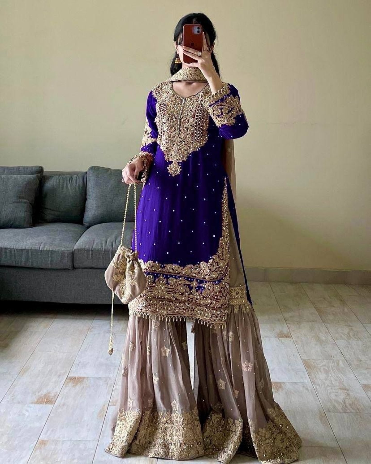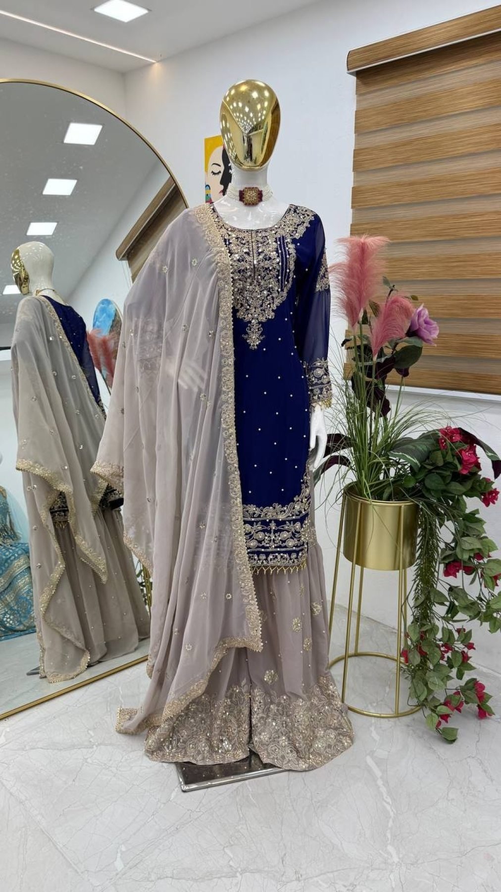 - Top: Made from luxurious Fox Georgette, adorned with real mirror work and codding sequence embroidery. Features a round neck, 20-inch sleeves, and a length of 40 inches. Available in sizes M, L, XL, and XXL.