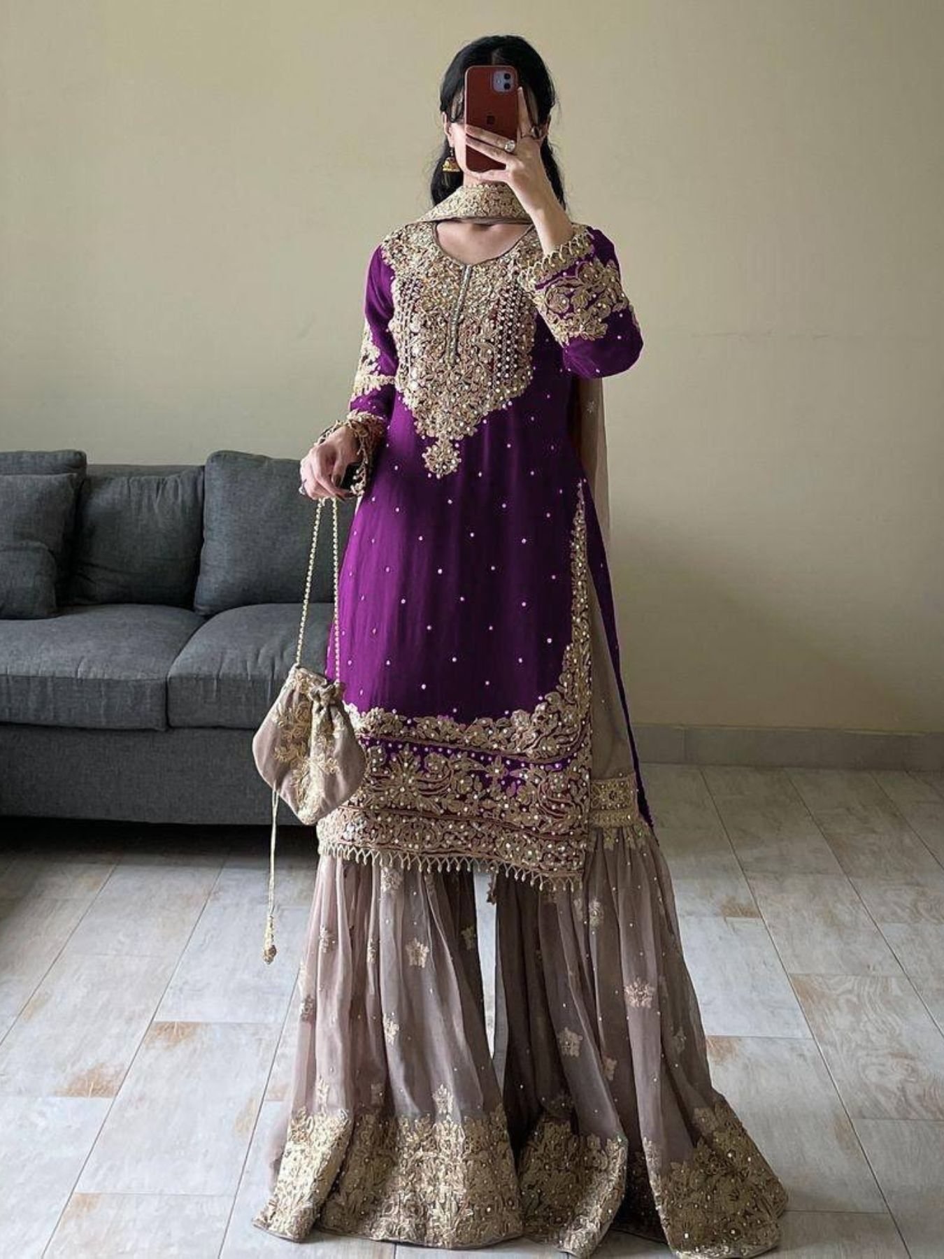 Premium Fox Georgette Party Wear Suit Set with Sharara Dupatta Stunning Embroidery Sequins Mirror & Lace Detailing