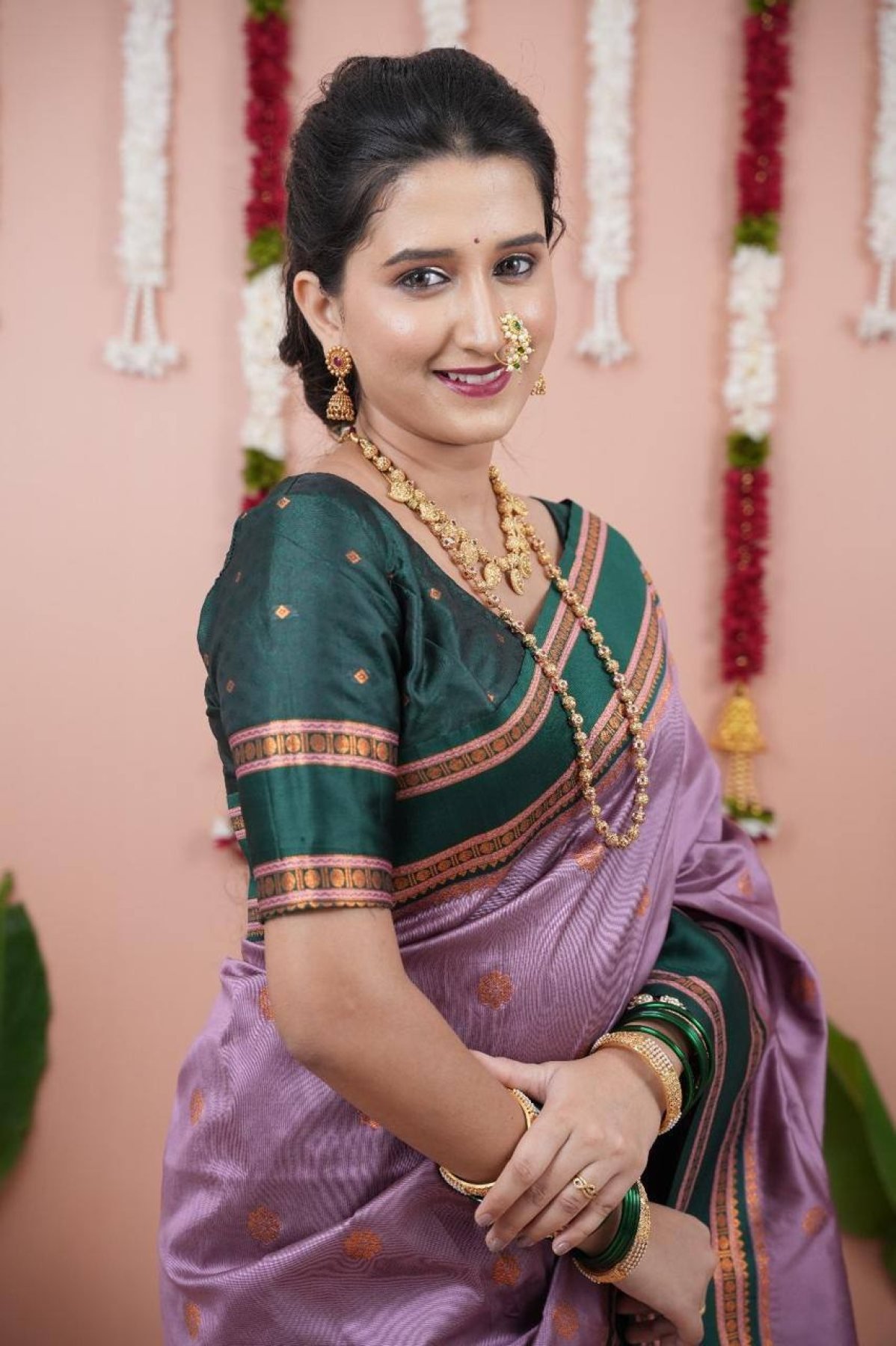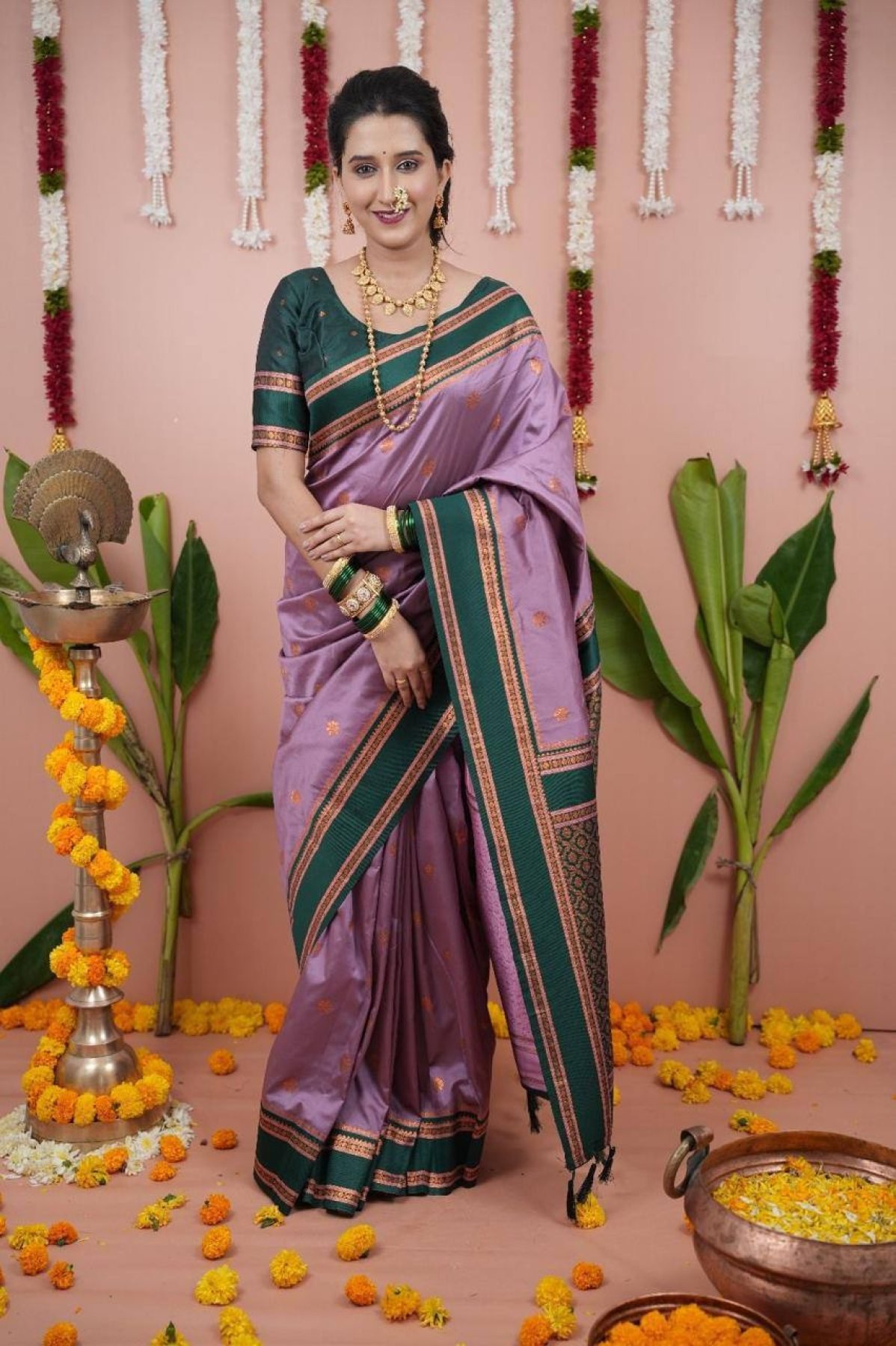 Premium soft silk saree in two tone fabric featuring elegant dual zari motifs with a rich woven contrast pallu and unique Narayan border. Paired with a matching contrast blouse, perfect for festive and traditional occasions.