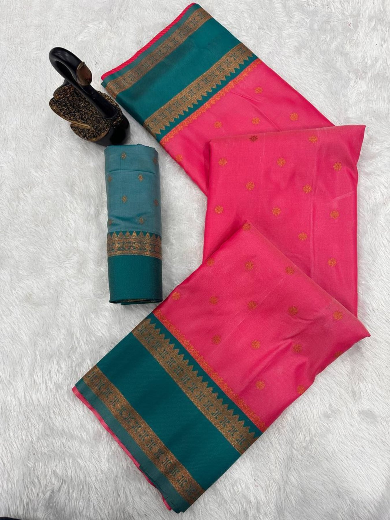 Premium soft silk saree in two tone fabric featuring elegant dual zari motifs with a rich woven contrast pallu and unique Narayan border. Paired with a matching contrast blouse, perfect for festive and traditional occasions.