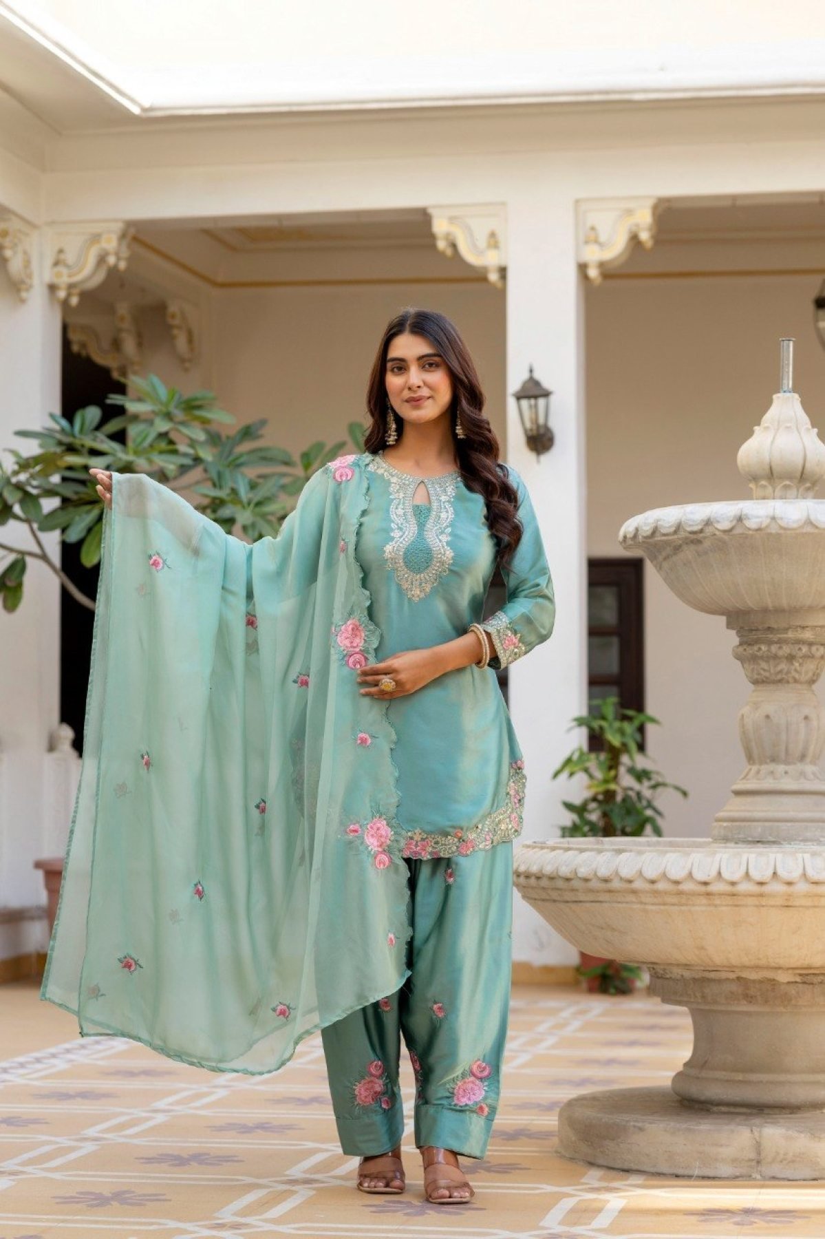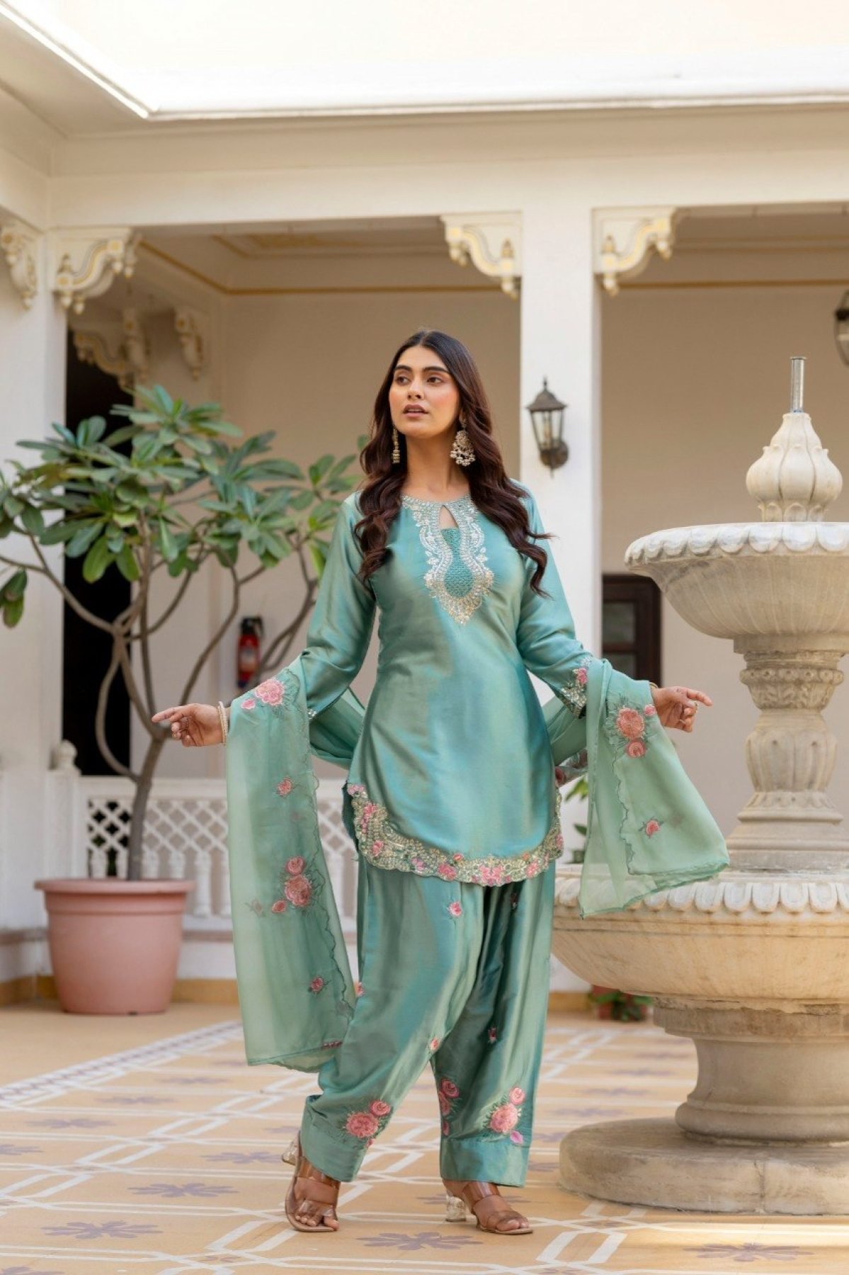Premium Japan satin kurti set with embroidered Patiala pant and matching dupatta. Stylish and comfortable ethnic wear, perfect for festive occasions, parties, and traditional functions.