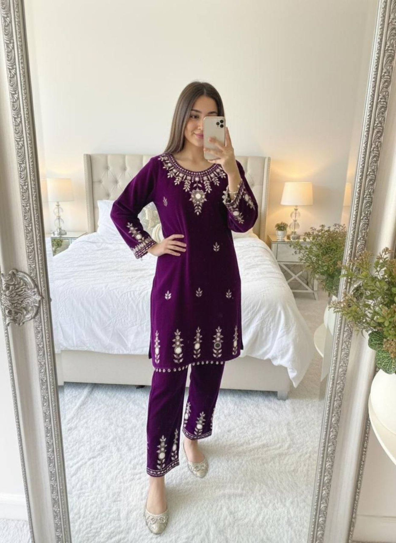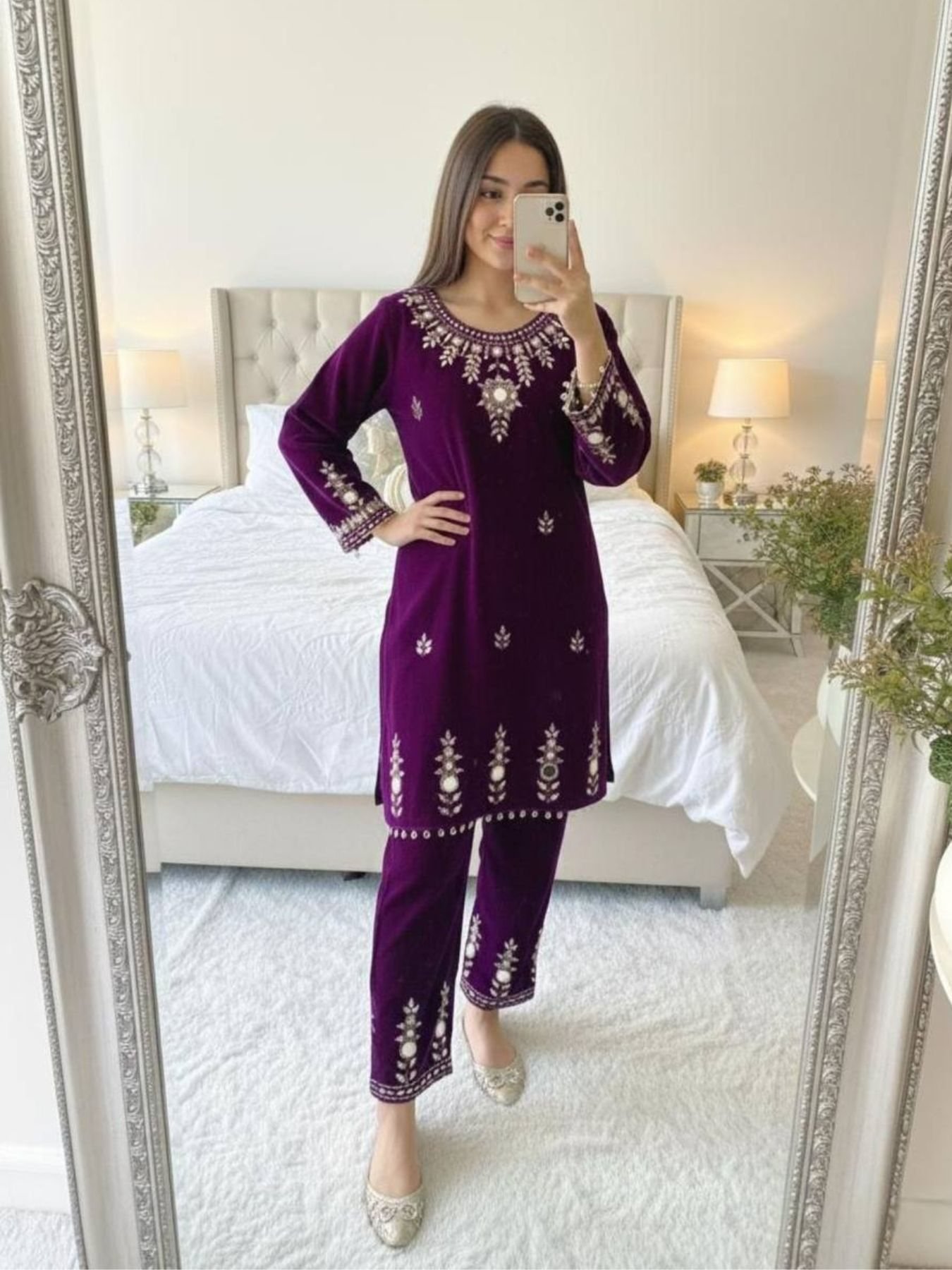 Make a bold winter style statement with this designer velvet co-ord set, crafted for warmth and festive elegance. The velvet top and plazzo are beautifully highlighted with intricate embroidery and real mirror work, adding a rich handcrafted appeal. Featuring a soft micro inner and fully stitched free-size plazzo, this outfit is ideal for winter celebrations, evening gatherings, and festive occasions. A premium winter wear choice for boutiques, wholesalers, and international buyers seeking standout velvet designs at manufacturer pricing.