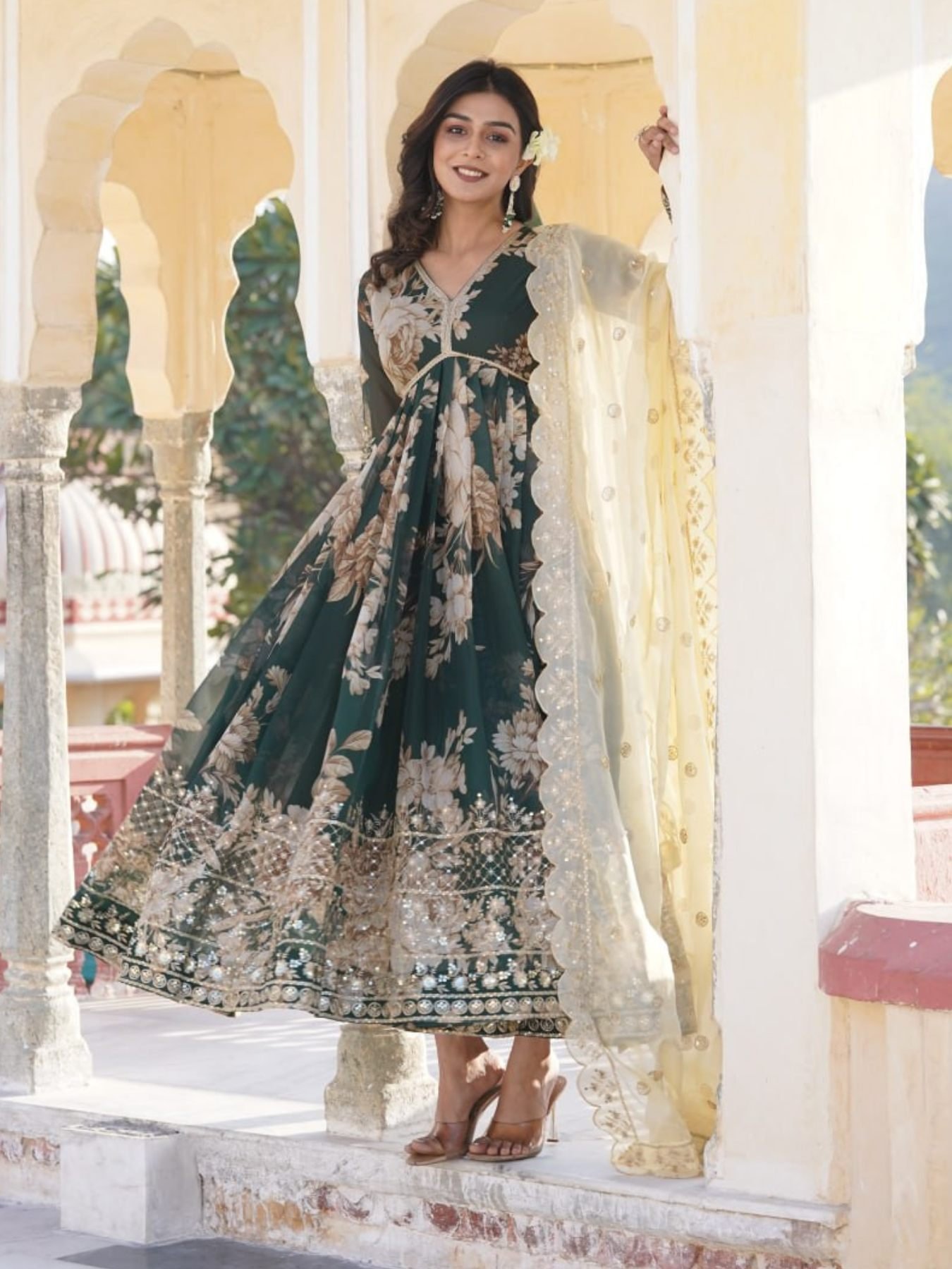 FABRIC & WORK * :- Digital printed Russian silk With Embroidery Zari Sequins-work