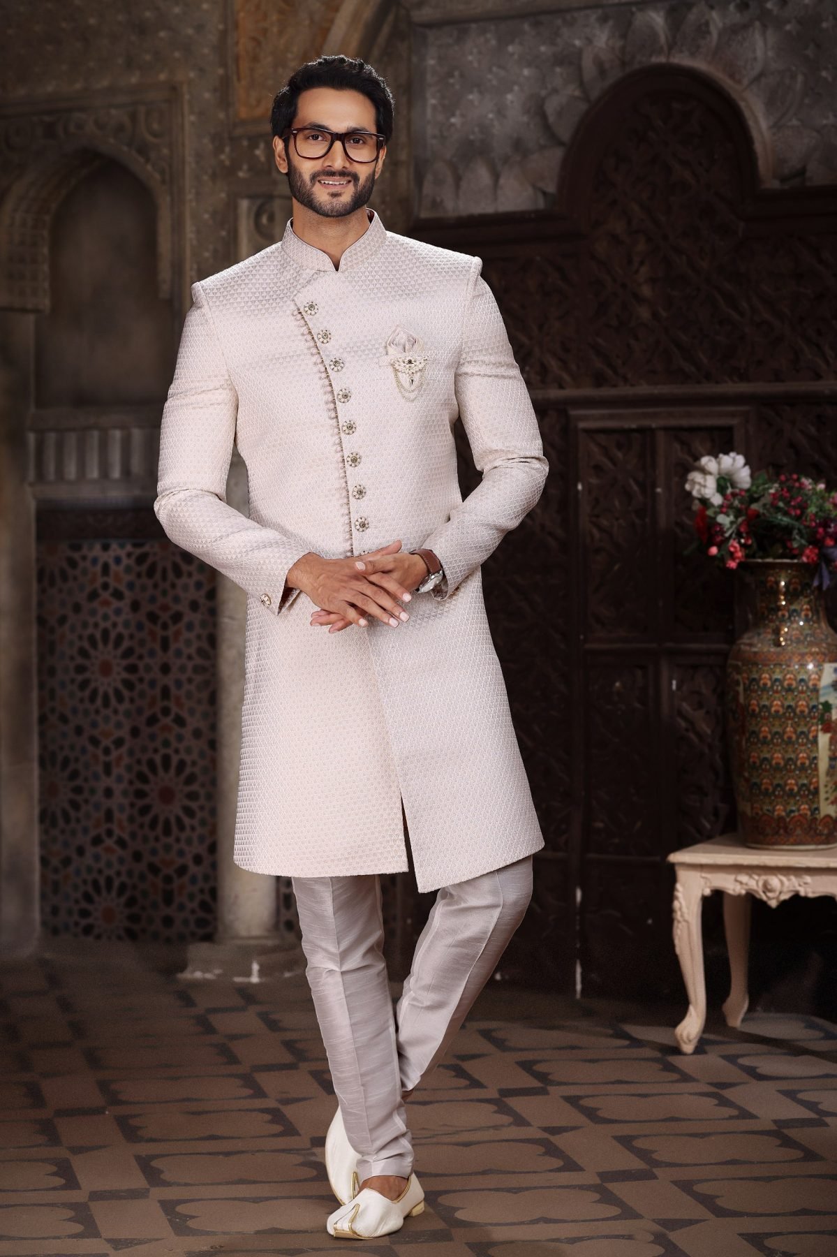 Premium Indo western set crafted in Banarasi jacquard with designer pattern work, paired with dupion art silk Aligarhi pants. Perfect for weddings and festive occasions.