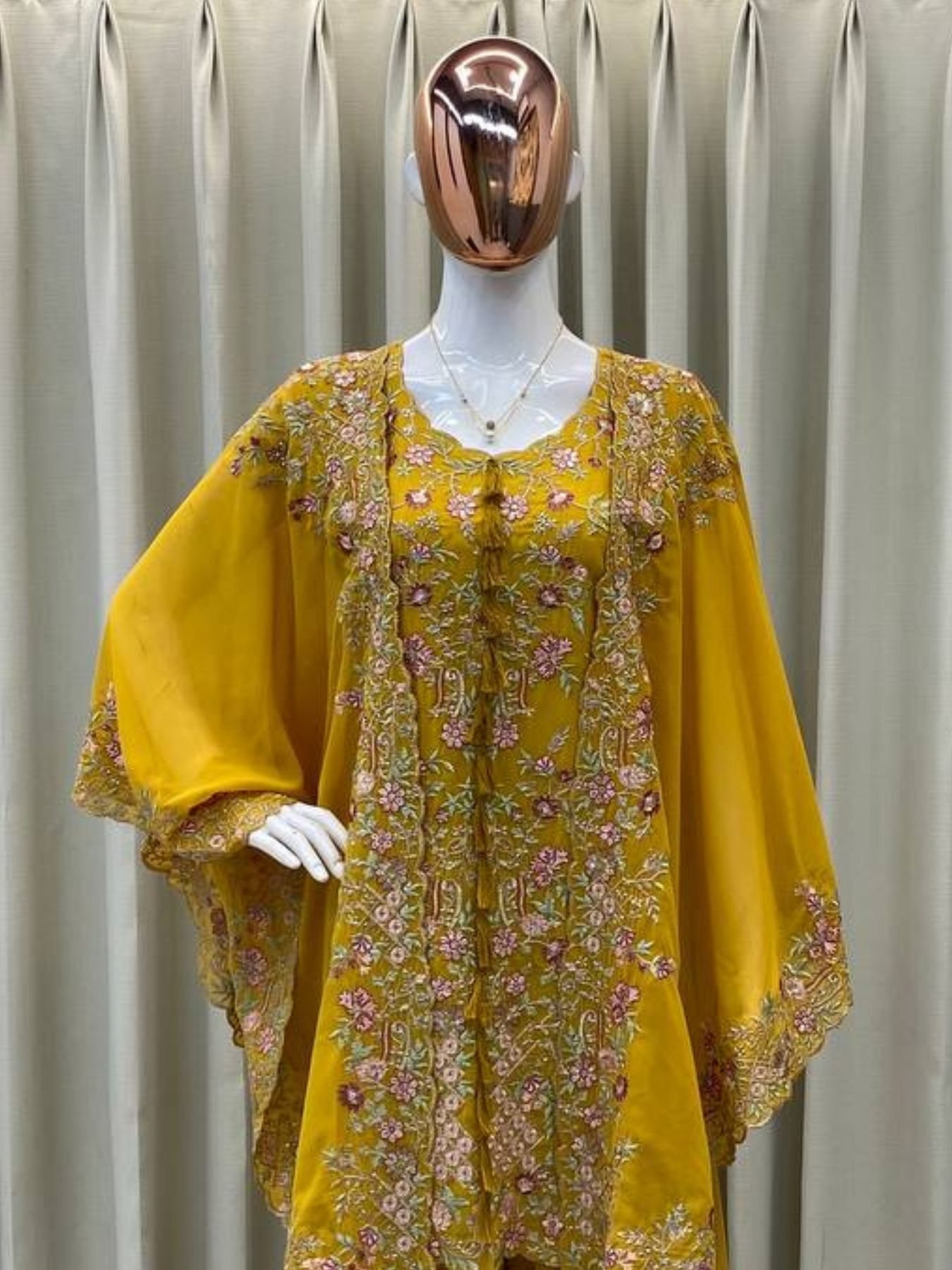 Premium Yellow Faux Georgette Ensemble with Plazzo and Shrug for Haldi Look