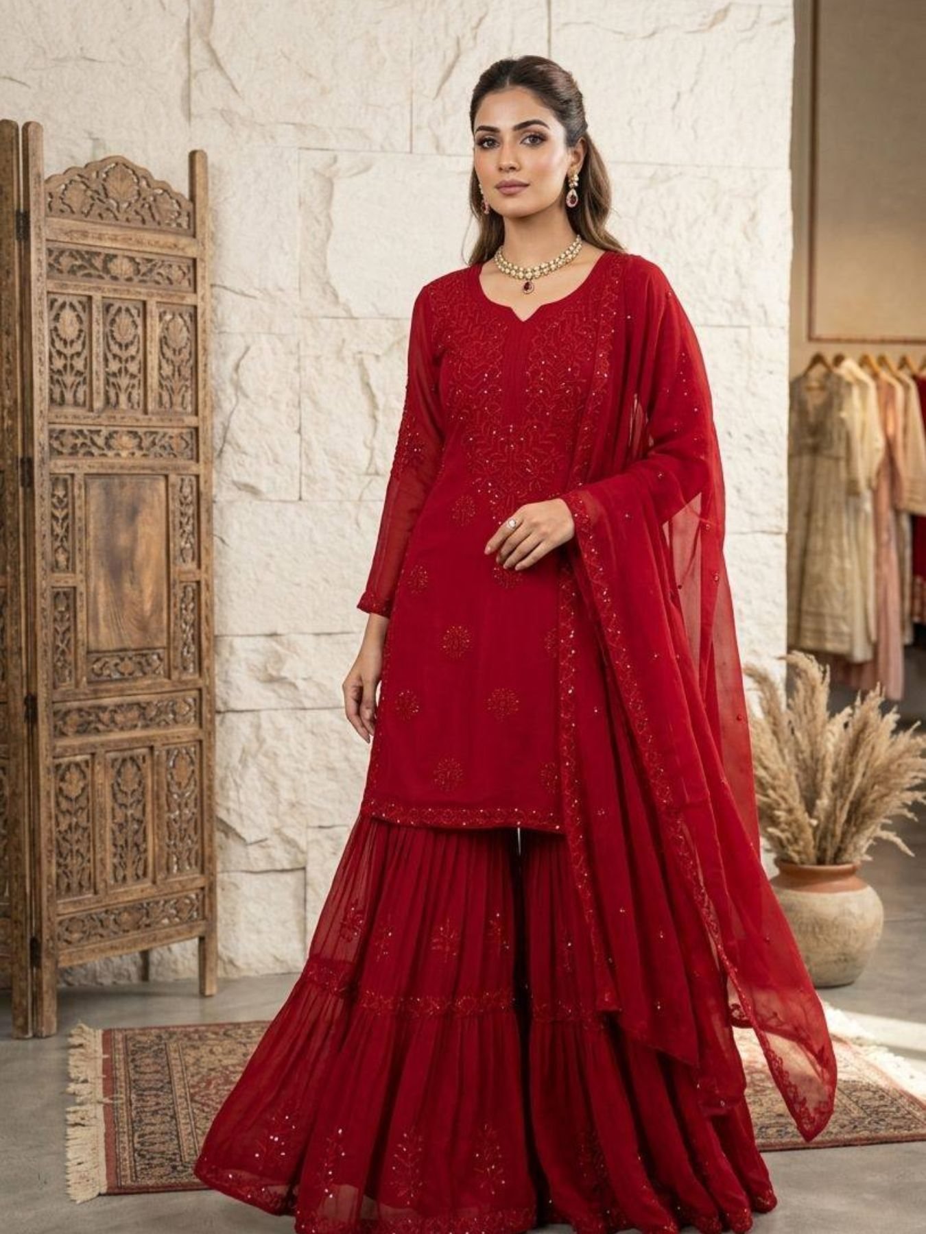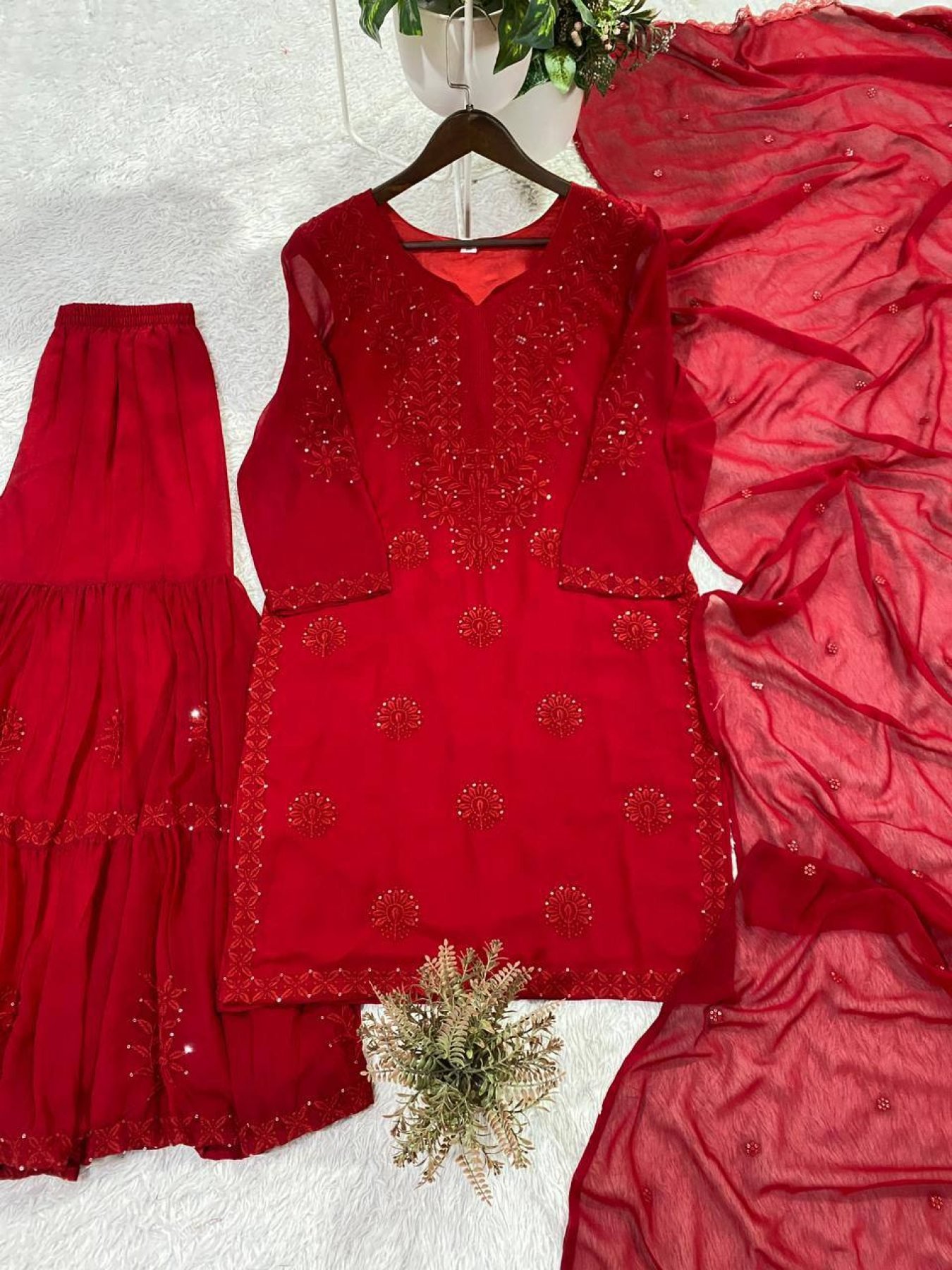 Prime Look Red Georgette Ethnic Sarara Set with Embroidery Work