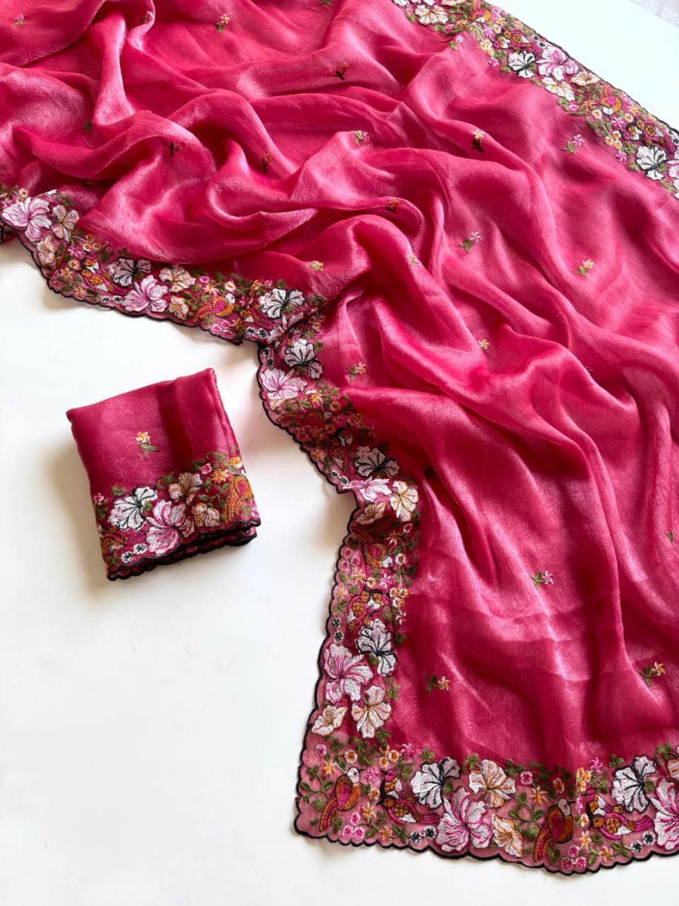 Step into elegance with this Pure Alexa Crush Saree, adorned with exquisite premium floral embroidery all over and a delicate cut-work embroidery border.