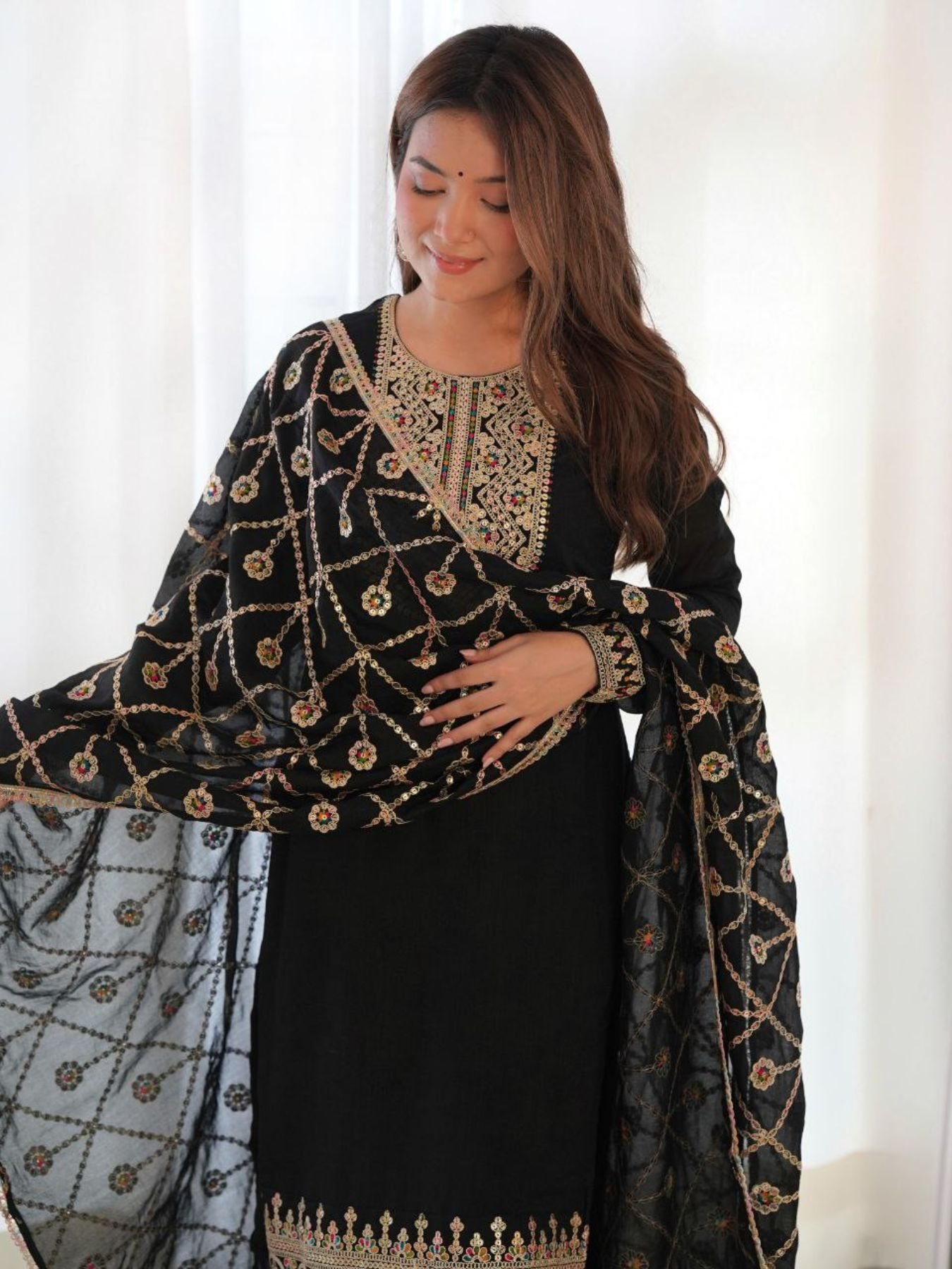 Crafted for elegance and comfort, this pure blooming Vichitra silk kurta set is designed with intricate embroidery, sequence, dori, and thread work on the yoke, sleeves, and round neckline. The fully stitched kurta, with a length of 43-44 inches, offers a flattering and graceful fit.