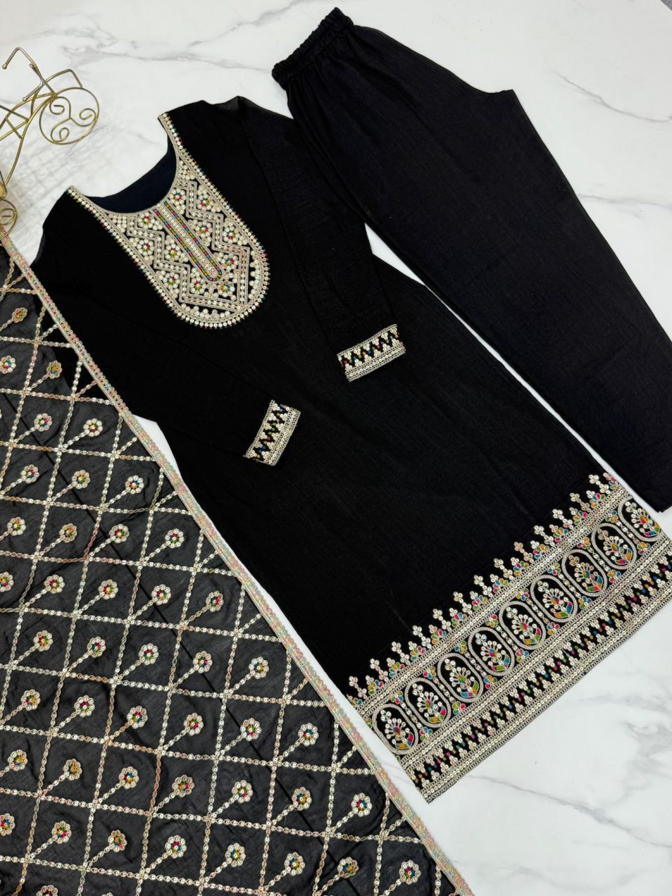 Paired with a 2.2-meter pure Vichitra silk dupatta, featuring detailed embroidery, dori and thread work, and a fancy lace border, this ensemble exudes sophistication. The set is completed with heavy pure Vichitra silk free-size pants, providing both style and comfort.