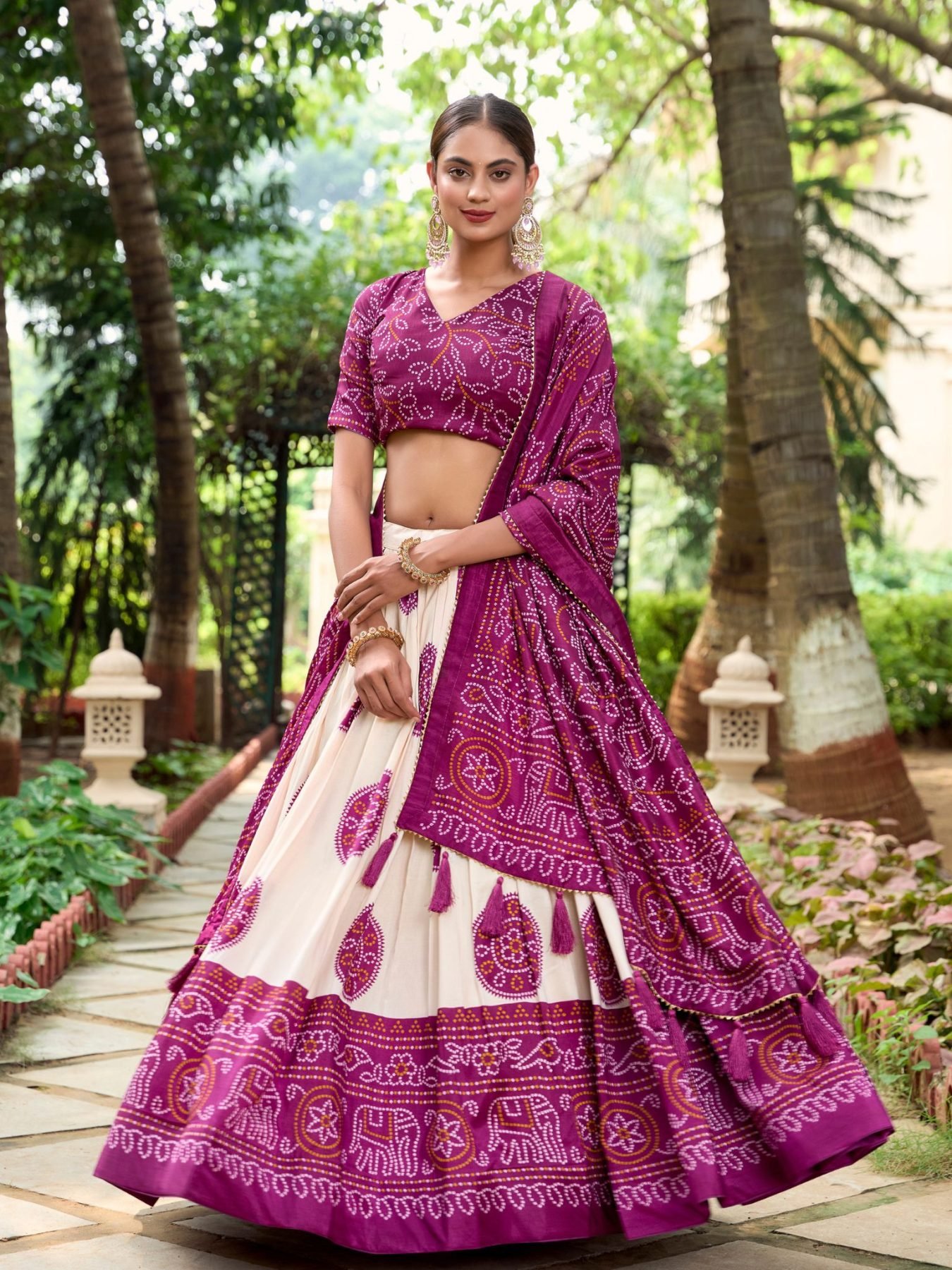 Purple Bandhej Print Lehenga Choli In Tussar Silk