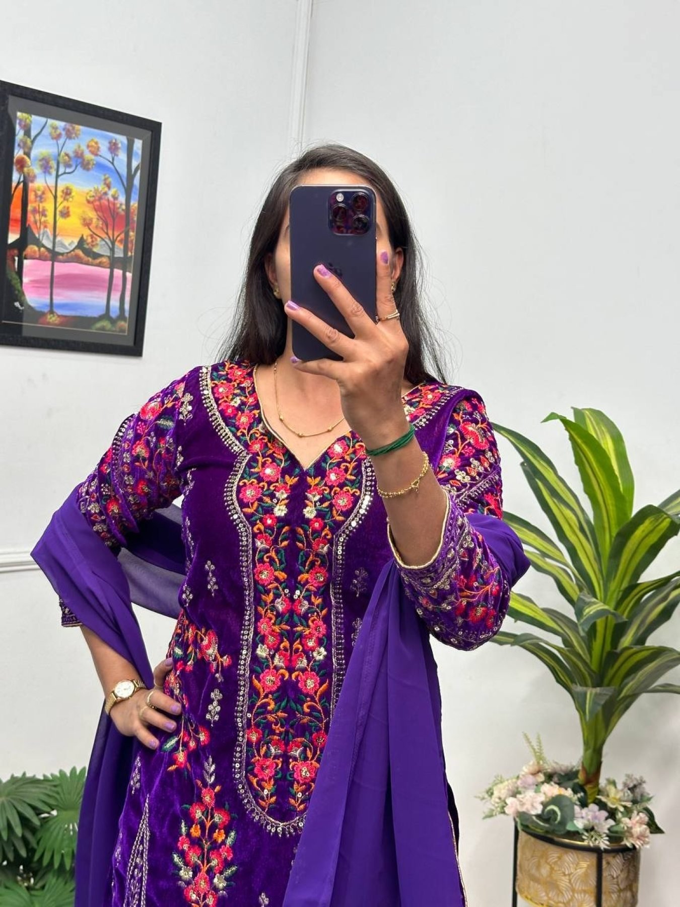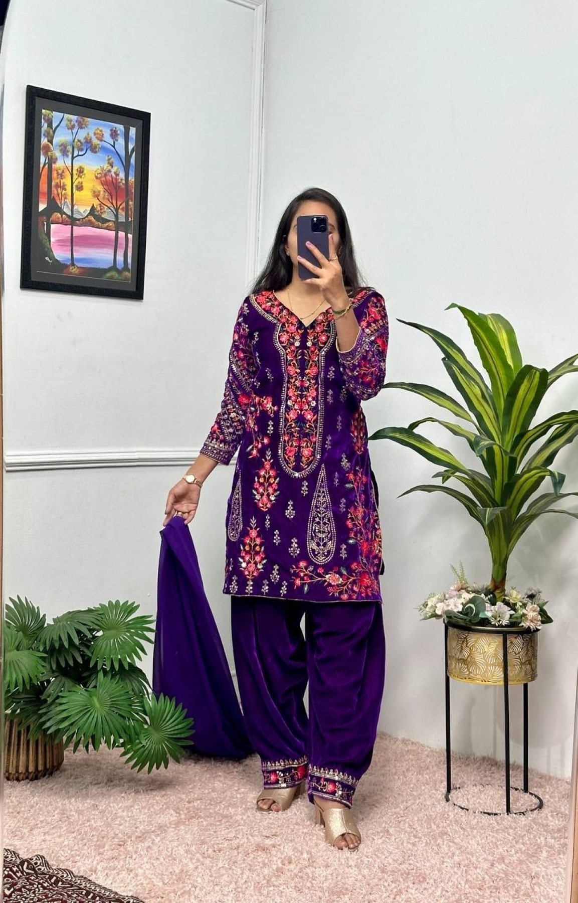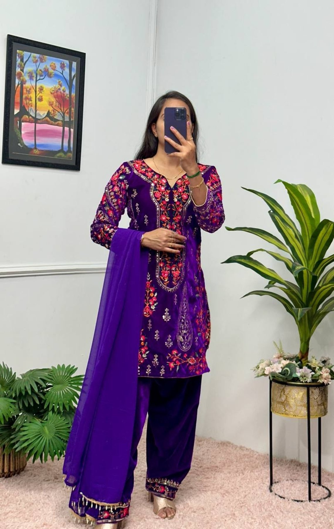 Purple Color 9000 Velvet Embroidery Work Patiyala 3-Piece Kurti Set
