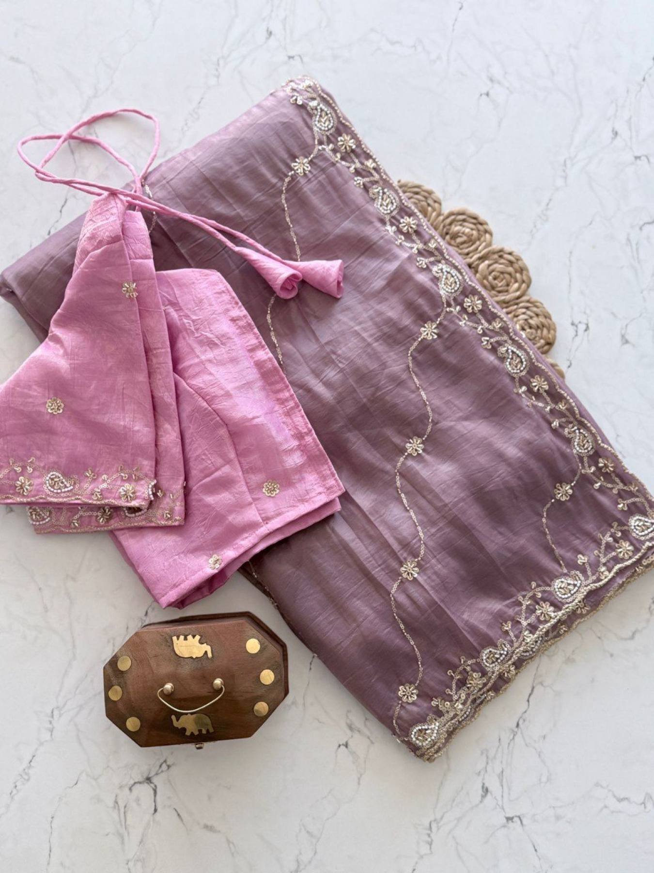 Purple Color Pure Gold Crush Silk Saree With Hand Embroidery and Contrast Blouse